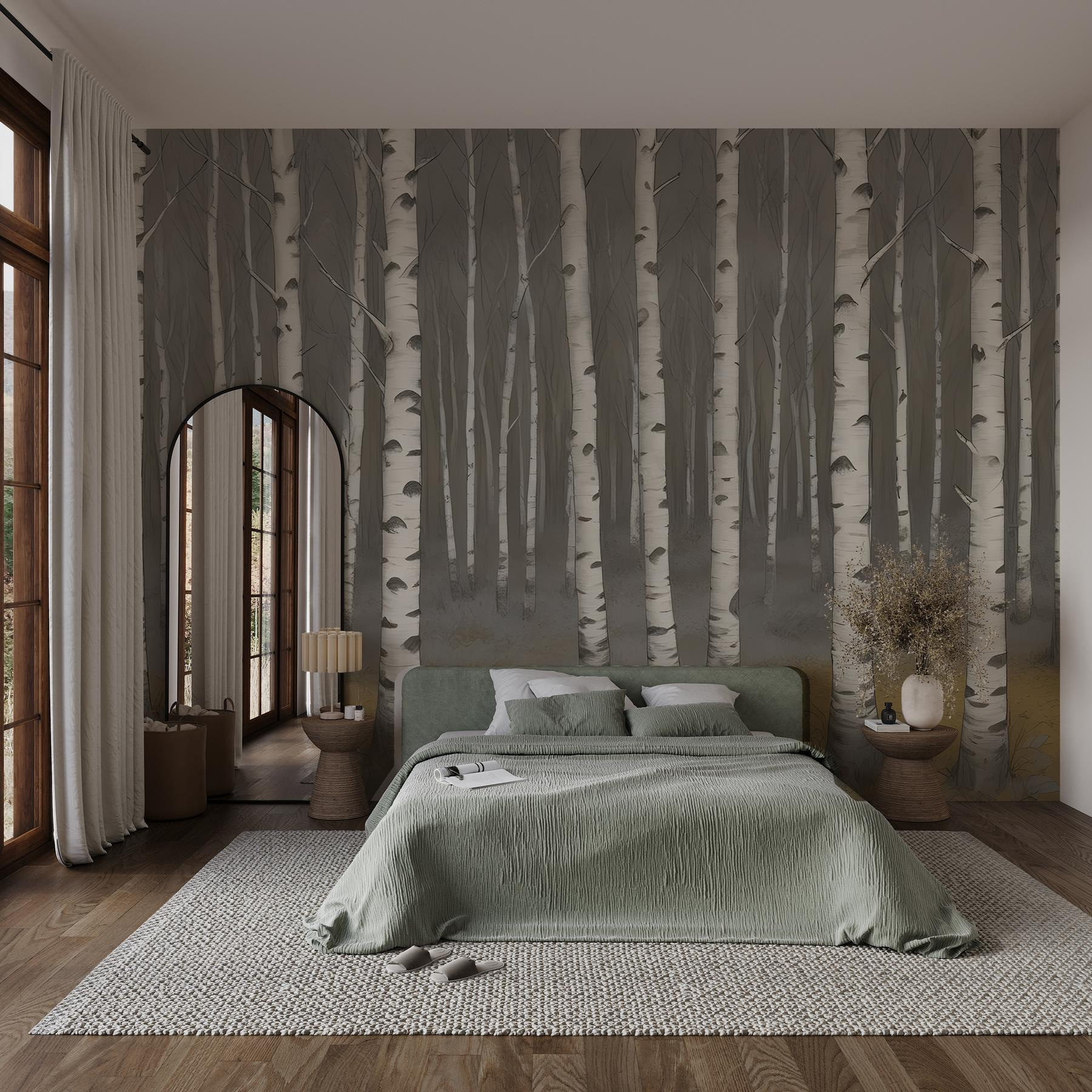Verander elke kamer in een serene ontsnapping met deze betoverende muurschildering van berkenbomen. Het is alsof je een rustig bos in huis haalt. Stel je voor dat je thee drinkt op een gezellige middag, omringd door zachte witte boomstammen die zachtjes wiegen in een denkbeeldig briesje. De gedempte kleuren creëren een rustgevende sfeer, perfect voor een slaapkamer of leeshoek. Bovendien heeft de eenvoud van de natuur iets magisch, nietwaar? Maak je klaar om dagelijks die vredige woudenergie te voelen – zonder de vervelende insecten of modderige laarzen. Omarm de schoonheid van de natuur binnenshuis en zie hoe je ruimte tot leven komt!