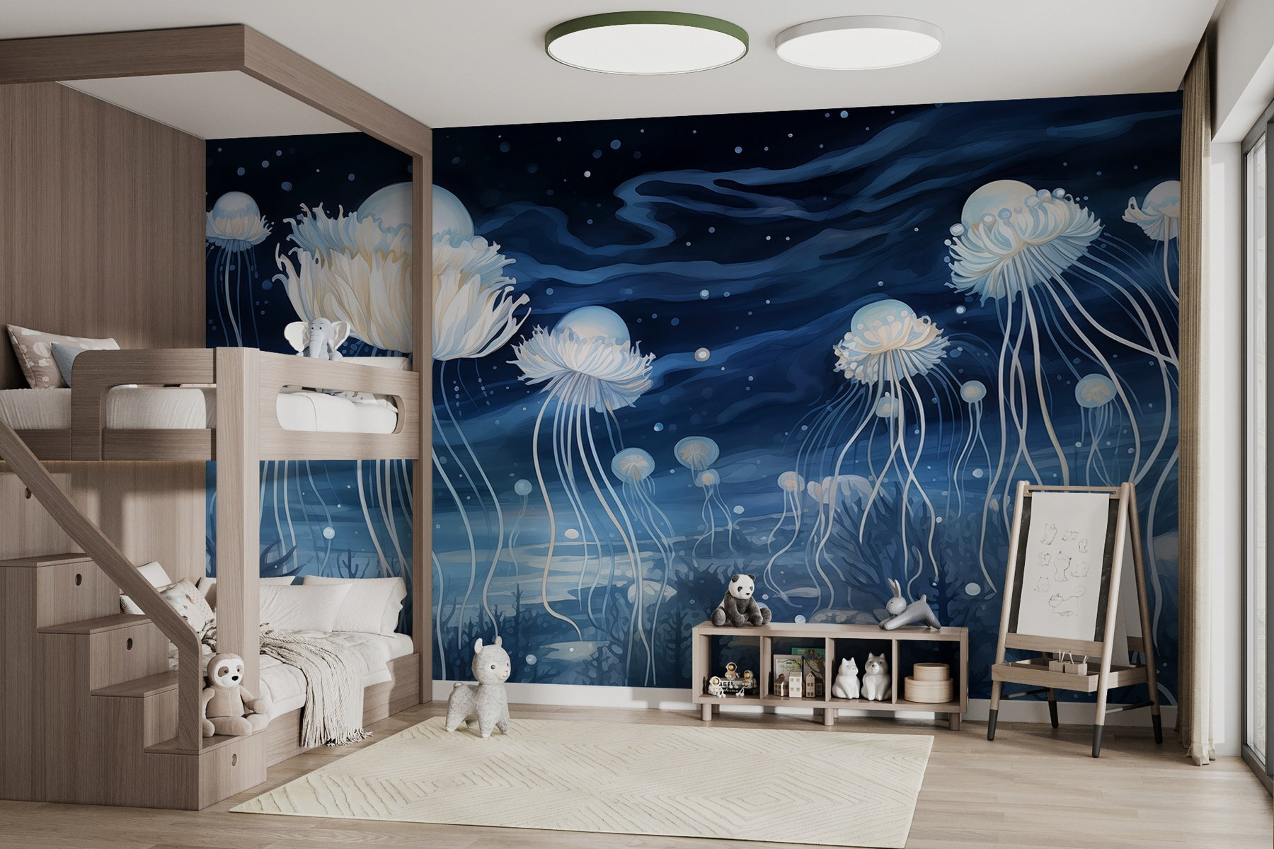 Verander elke ruimte in een rustgevend onderwaterdroomlandschap met deze adembenemende muurschildering van kwallen die door een sterrenhemel glijden. Stel je voor: als je de kamer binnenstapt, voelt het alsof je in een oceaan van rust drijft, toch? Het zachte blauw en wit van de kwallen danst sierlijk, terwijl de nachtelijke hemel knalt met kleine sterren, wat zorgt voor die etherische sfeer. Perfect voor een woonkamer of een gezellige leeshoek – je zou jezelf wel eens kunnen betrappen terwijl je wegdroomt, in gedachten verzonken. Het is ook een gespreksstarter! Vrienden vragen je misschien of je met kwallen hebt gezwommen. Stel je hun verbazing voor als je nee zegt, je hangt gewoon thuis rond!