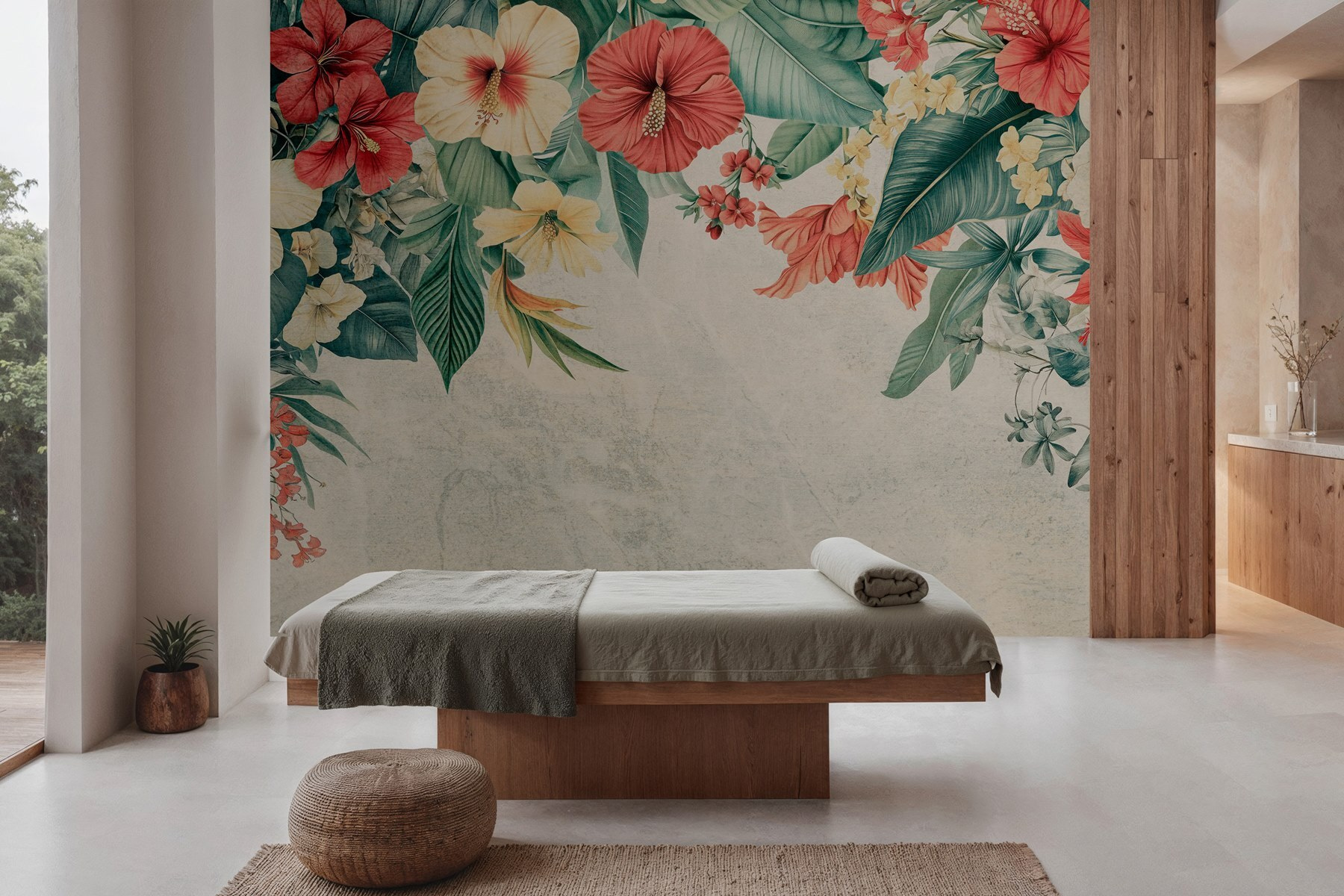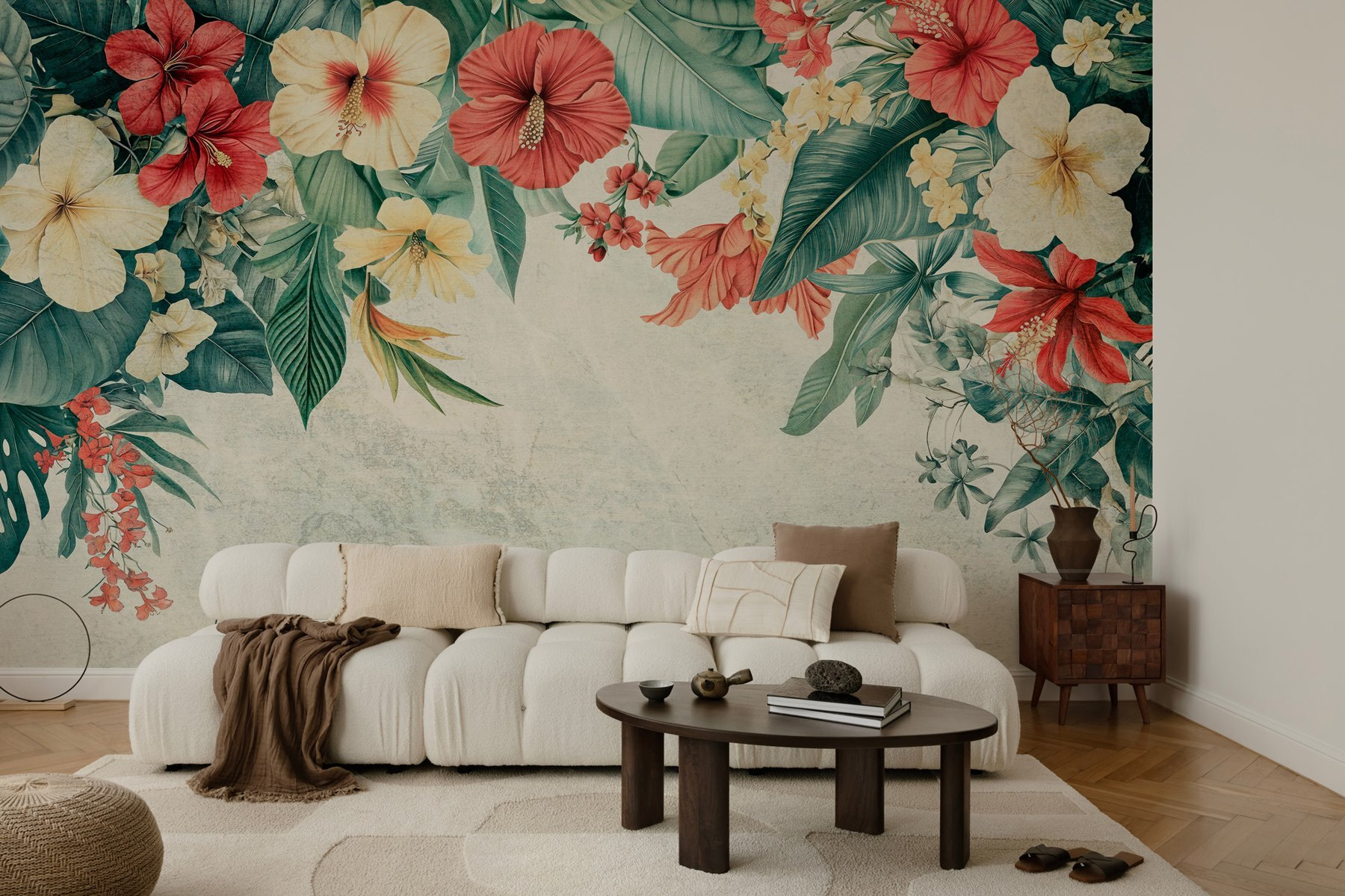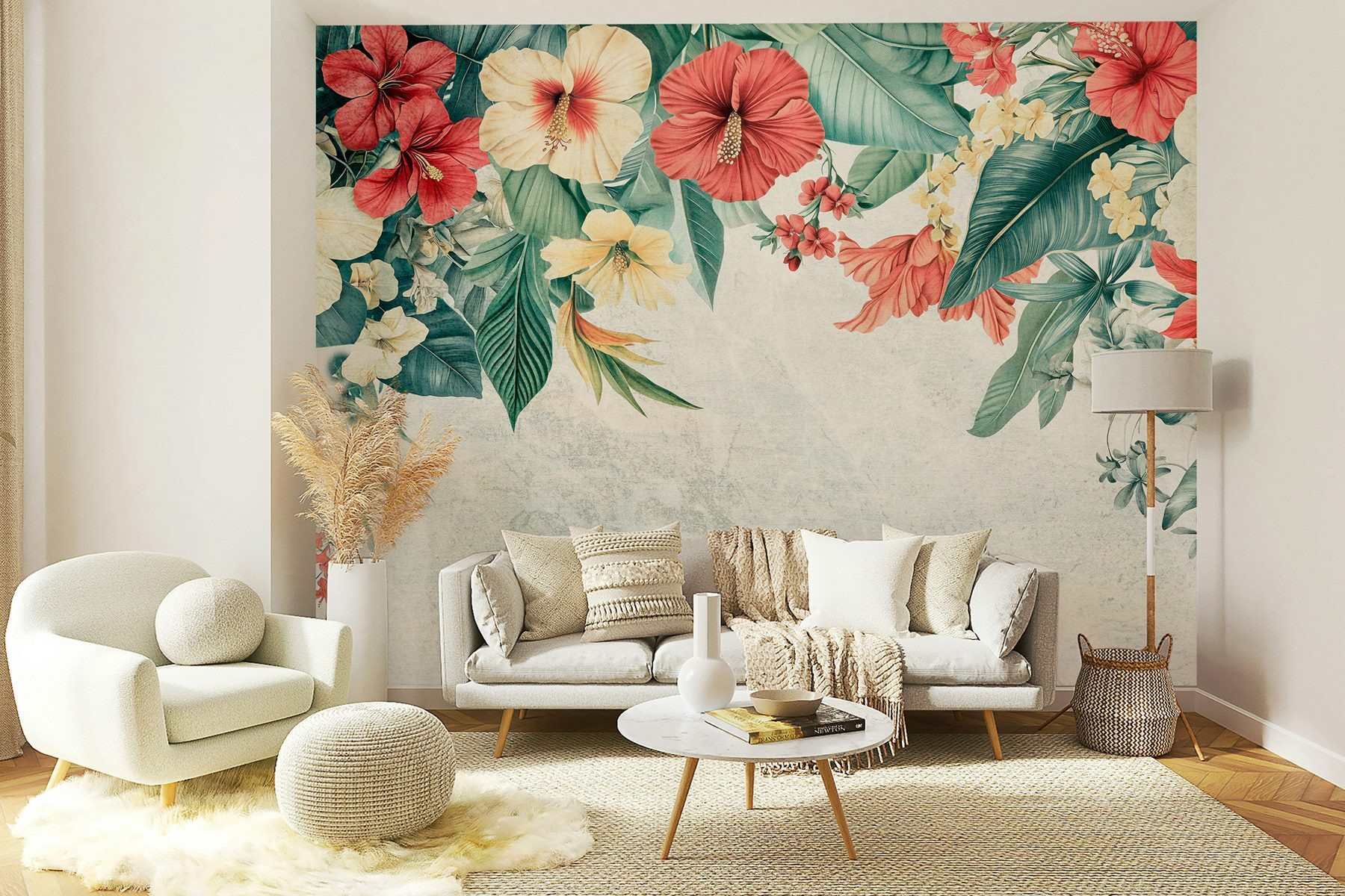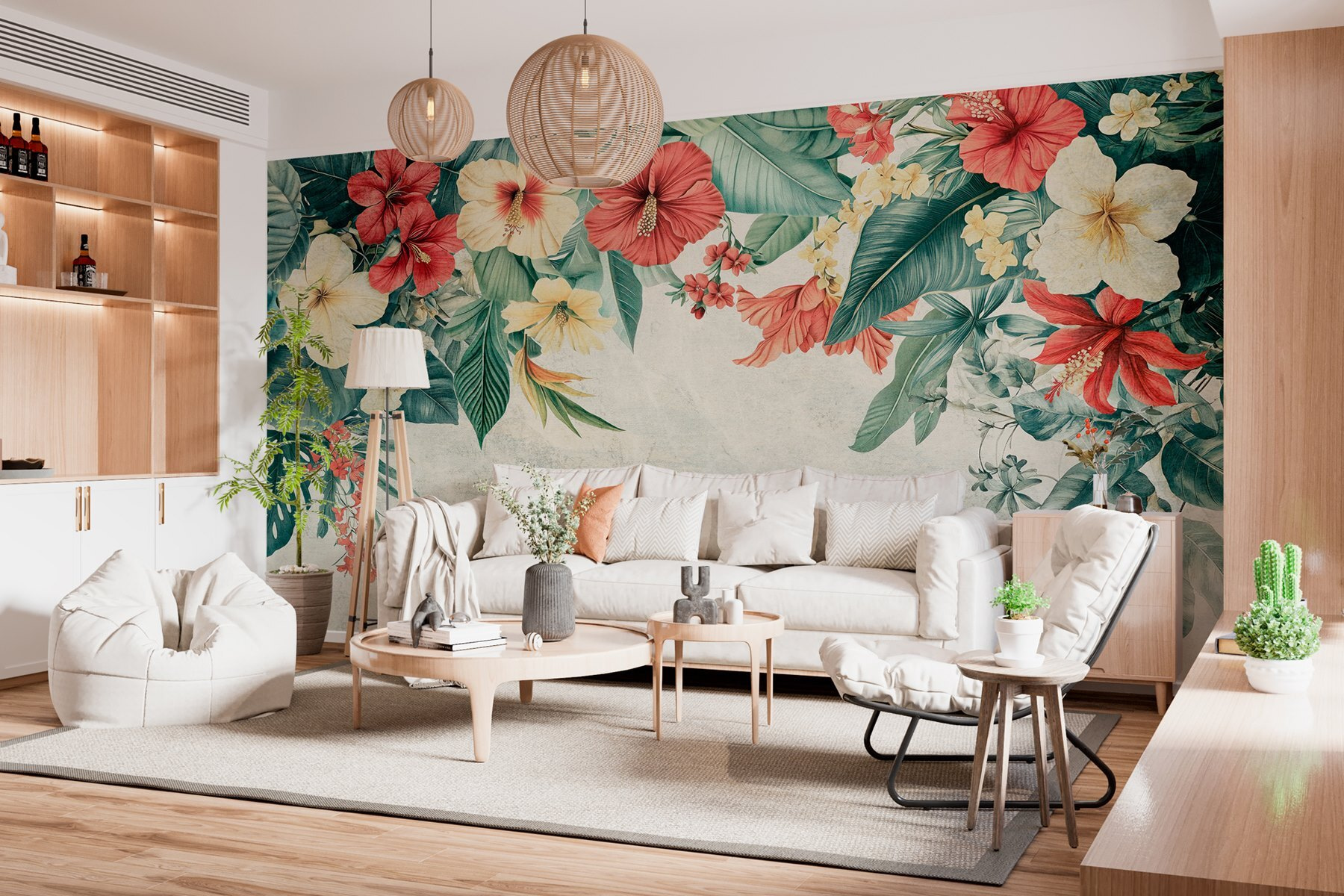 Transform your space into a tropical paradise with this mural, “Vibrant Blooms Frame a Serene Background.” Picture this: you walk into your room, and bam! You’re greeted by blossoms bursting with color, as if a spring day took up permanent residence on your wall. The mix of red hibiscus, creamy yellows, and deep greens creates a sensory delight—it’s like nature’s own confetti. Imagine sipping morning coffee here; it’s easy to forget the outside world. Plus, it brings those vacation vibes right into your home, minus the sunscreen. Perfect for a living room or cozy nook, this mural’s got character and charm. Who wouldn’t want a little slice of nature’s beauty framed with such flair?