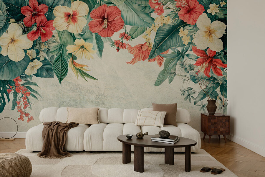 Verander uw ruimte in een tropisch paradijs met deze muurschildering, “Vibrant Blooms Frame a Serene Background”. Stel u voor: u loopt uw kamer binnen en bam! U wordt begroet door bloesems die barsten van de kleur, alsof een lentedag permanent op uw muur is neergestreken. De mix van rode hibiscus, romig geel en diepgroen zorgt voor een zintuiglijk genot – het is als confetti uit de natuur. Stel je voor dat je hier ‘s ochtends van je koffie nipt; je vergeet gemakkelijk de buitenwereld. Bovendien brengt het die vakantiesfeer naar je huis, zonder dat je zonnebrandcrème nodig hebt. Deze muurschildering is perfect voor een woonkamer of een gezellig hoekje en heeft karakter en charme. Wie wil er nu niet een stukje natuurschoon omlijst met zoveel flair?