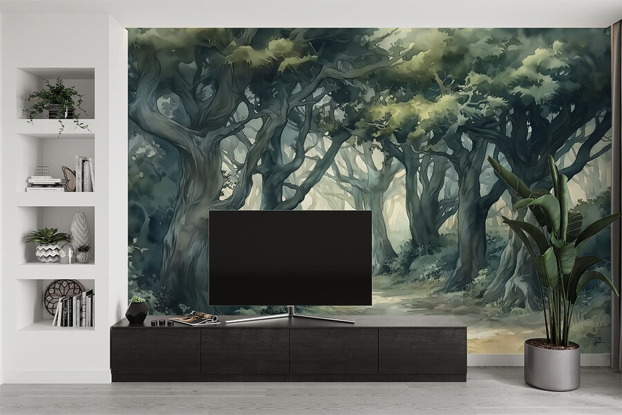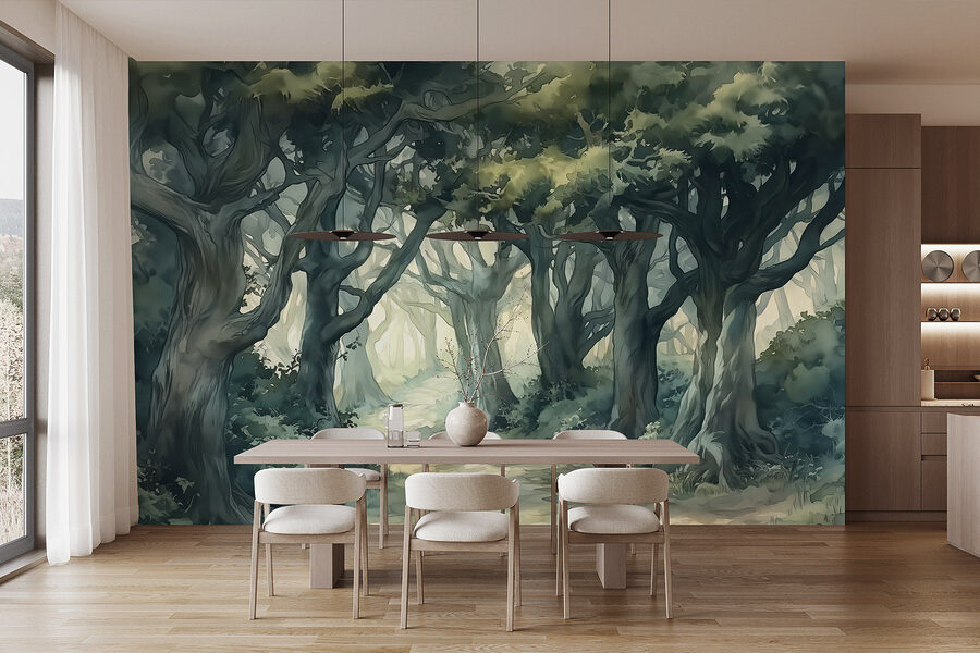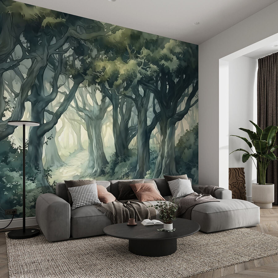 De zachte tinten en gedetailleerde bomen creëren een vredige sfeer, waardoor het ideaal is voor een gezellige leeshoek of een serene slaapkamer. Stel je voor dat je gaat zitten met een kopje thee, het rustgevende tafereel om je heen als een warme knuffel. En wie zei dat de natuur niet thuis kan komen? Voeg deze muurschildering toe en plotseling wordt dagdromen over bosavonturen een dagelijkse bezigheid.