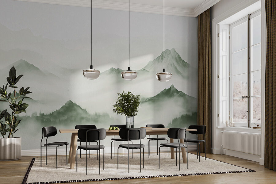 Verander uw muren in een serene ontsnapping met de muurschildering “Foggy Mountain Landscape”. Stel u voor dat u een kamer binnenloopt en het gevoel hebt dat u in een vredige, mistige bergmorgen bent beland. De zachte groentinten en wazige contouren van de bergtoppen creëren een gevoel van rust, perfect om te ontspannen na een lange dag. Het is bijna alsof de bergen geheimen fluisteren en u uitnodigen om diep adem te halen en te ontspannen. Vrienden zouden zelfs kunnen denken dat je een verborgen hut in het bos hebt! Deze muurschildering is niet alleen een decoratie; hij voegt een vleugje natuurlijke rust toe aan het dagelijks leven en brengt de vrije natuur naar je gezellige ruimte. Het is dromerig, het is rustgevend – wie zou dat niet willen? Of het nu in de woonkamer of in je thuiskantoor is, het zal zeker gesprekken en bewondering uitlokken.