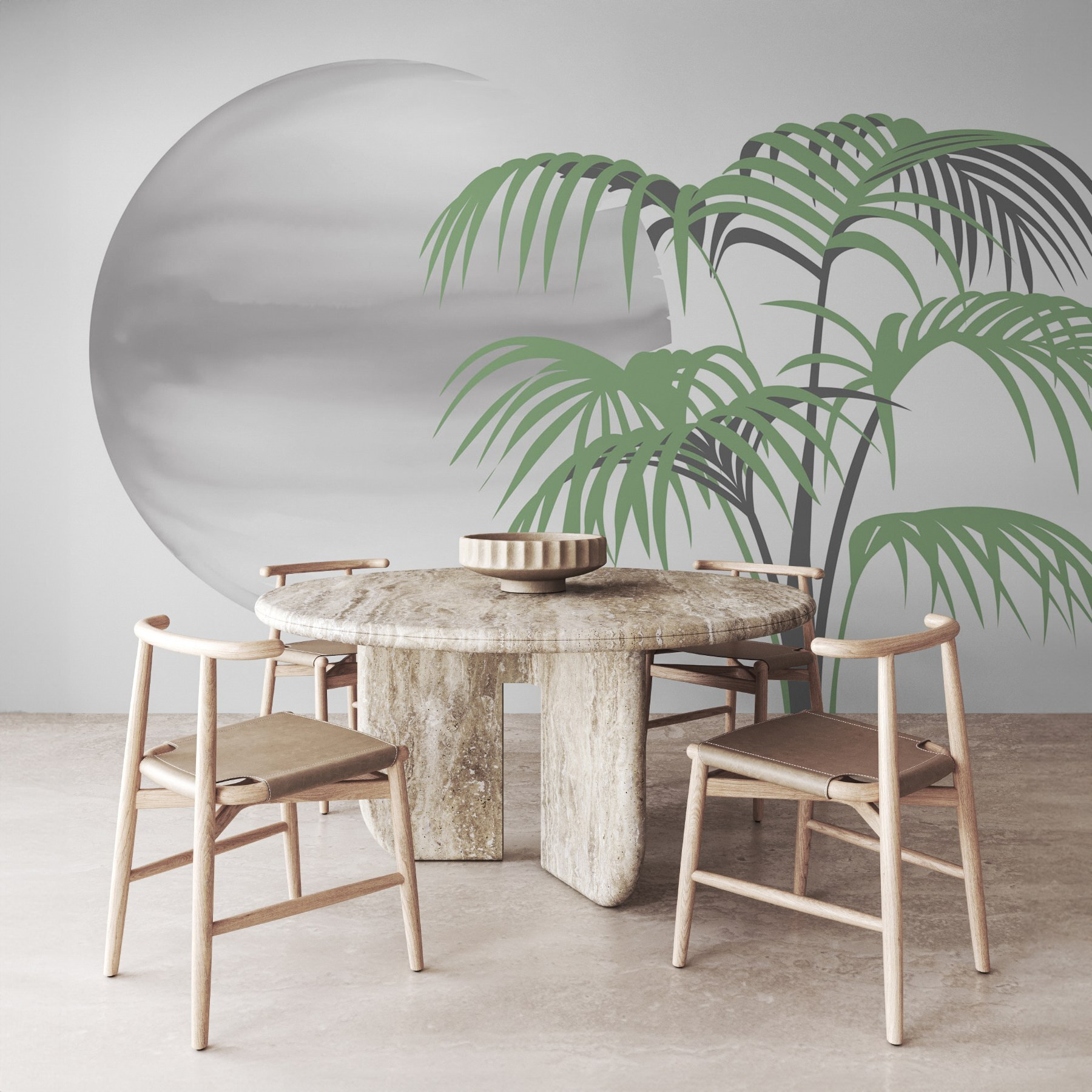 Verander elke kamer in een tropische oase met deze prachtige muurschildering met palmbomen en een zachte, ronde witte bol. Het is alsof je een stukje paradijs in je woonruimte haalt. Stel je voor dat je lekker met een boek gaat zitten terwijl de serene achtergrond je toefluistert: “Hé, het leven is een strand!” Het kleurenpalet is rustig en toch fris; perfect voor die dagen waarop je gewoon even wilt chillen. Of het nu in de woonkamer is of in je thuiskantoor, deze muurschildering straalt rust uit, waardoor elke dag aanvoelt als een minivakantie. Wie wil dat nou niet? Decoreer, kom tot rust en ontsnap zonder je huis te verlaten.