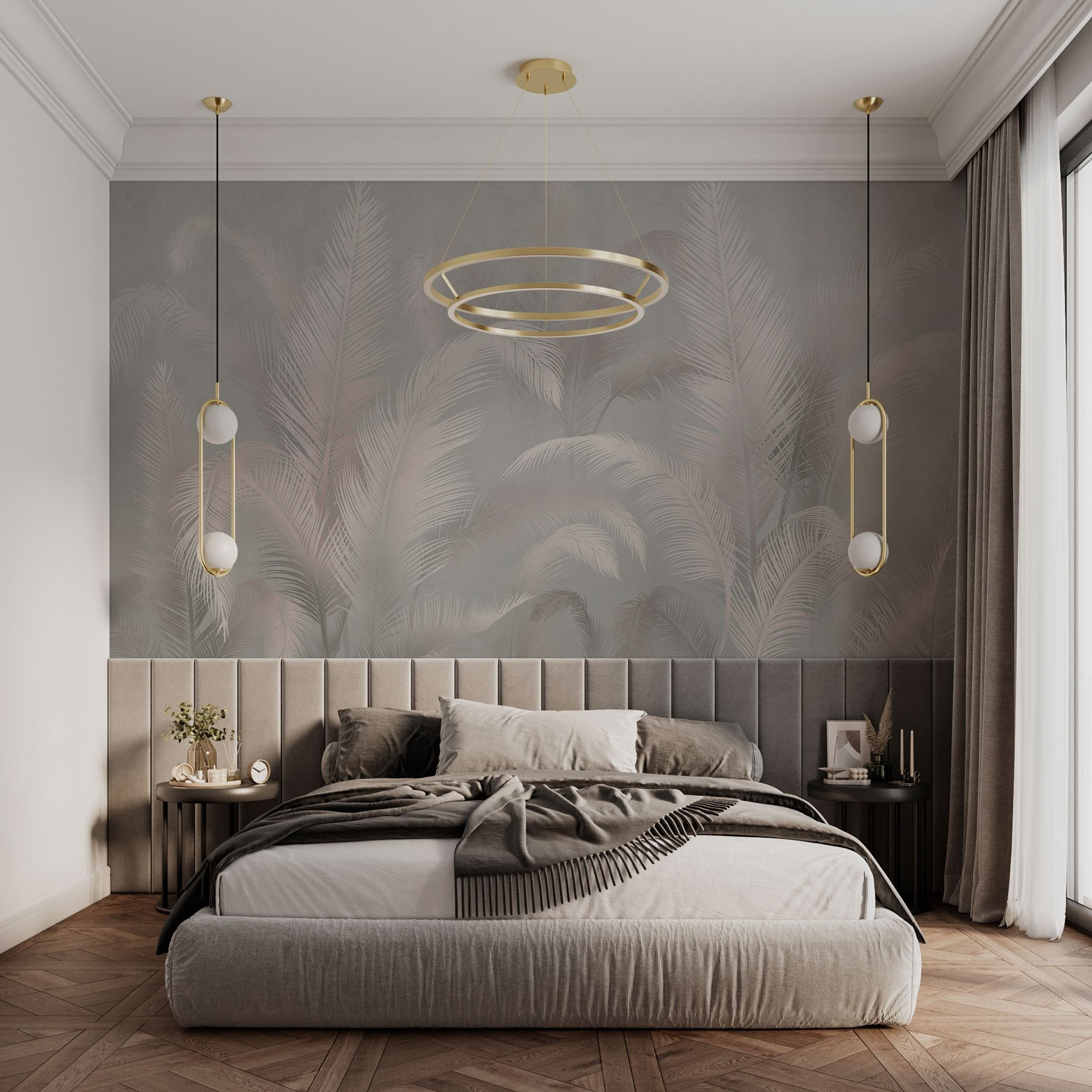 Verander uw ruimte in een serene oase met deze prachtige muurschildering met delicate palmbladeren in zachte, gedempte tinten. Stelt u zich eens voor dat u wakker wordt met een zacht kleurenpalet dat rust uitstraalt in plaats van om aandacht te schreeuwen. De rustgevende kleuren creëren een achtergrond die zowel fris als tijdloos aanvoelt – perfect voor elke kamer die een vleugje natuurlijke charme nodig heeft. Het is alsof u een rustig tropisch toevluchtsoord in huis haalt. Het heeft die sfeer waarin je bijna de golven in de verte kunt horen breken, nietwaar? Of het nu gaat om een gezellig leeshoekje of een levendige ontmoetingsruimte, deze muurschildering omhult uw muren met een zachte omhelzing. Dus ga uw gang, laat die weelderige bladeren een beetje rust brengen in uw dagelijkse chaos. Bovendien, wie houdt er niet van het idee om omringd te zijn door weelderig groen, ook al is het maar op de muur?