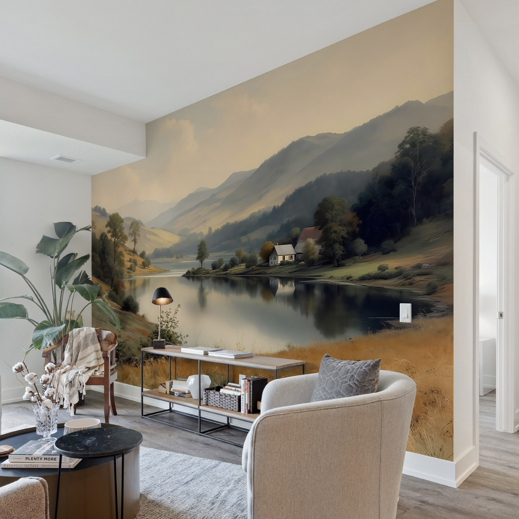 Verander een saaie muur in een serene ontsnapping met deze prachtige muurschildering van een vredig meer, een charmant huis en zachte bomen. Stel je voor dat je koffie drinkt op de bank terwijl je de rustige sfeer opsnuift. De zachte tinten fluisteren “relax” en nodigen uit tot rust in je kamer. Stel je een zondagochtend voor, vogels fluiten buiten en het licht stroomt naar binnen. Het is alsof je een stukje natuur in je woonkamer hebt. Perfect voor liefhebbers van het buitenleven of iedereen die behoefte heeft aan een mini-uitstapje in eigen huis. Dus waarom niet een stukje sereniteit in huis halen?