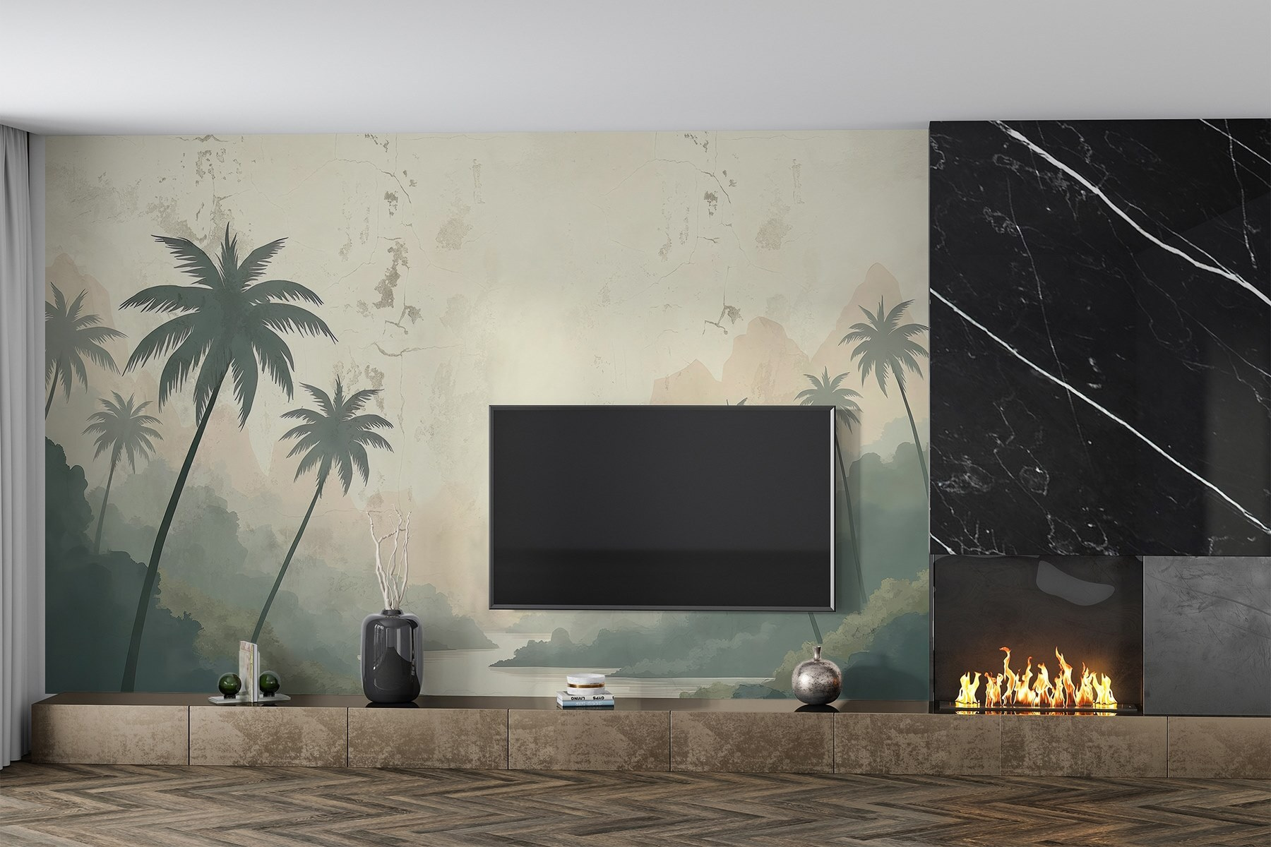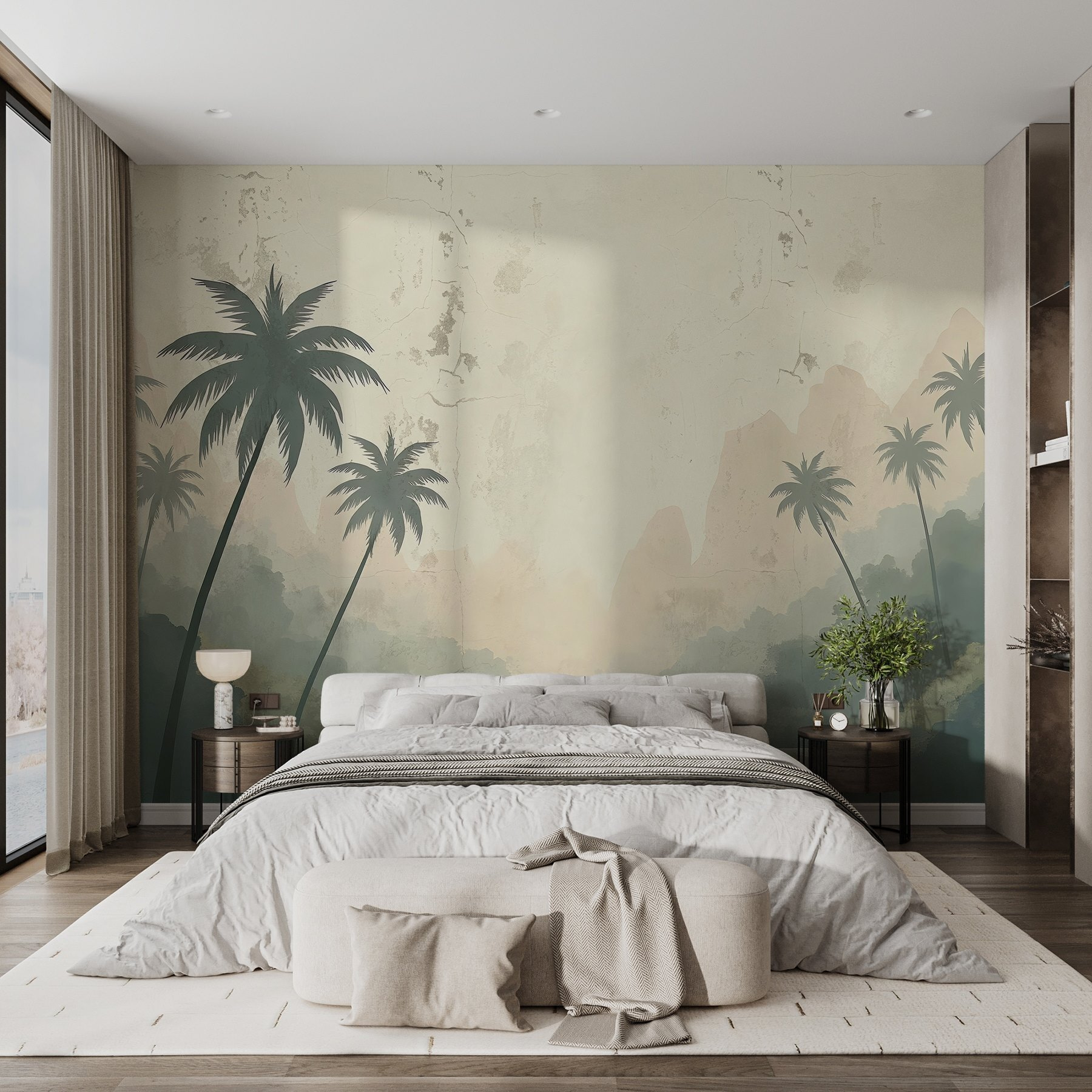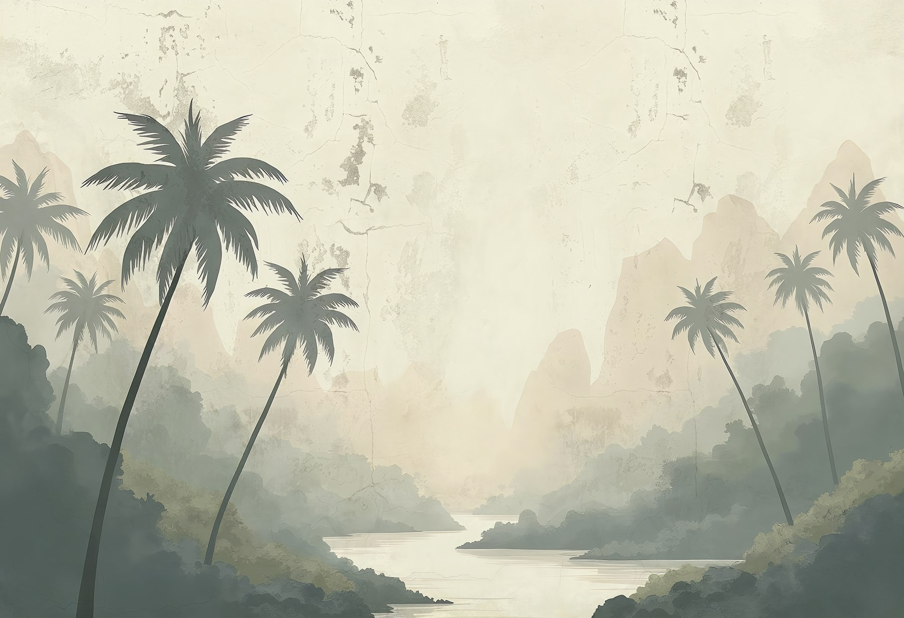 Een kamer omtoveren in een sereen toevluchtsoord is net zo eenvoudig als deze prachtige muurschildering van een rivier omringd door dromerige bomen en majestueuze bergen. Stel je voor dat je na een lange dag thuiskomt, in je luie stoel wegzakt en het gevoel hebt dat je naar een vredig tropisch paradijs bent getransporteerd. De zachte kleuren roepen het zachte ochtendlicht op en fluisteren beloftes van rust. Deze muurschildering is perfect voor een knus hoekje of een opvallende muur en nodigt uit tot dagdromen over verre avonturen. Wie wil er nu geen stukje natuur in huis? Het voegt diepte, karakter en een vleugje reislust toe aan elke ruimte – een stukje natuur binnen handbereik.