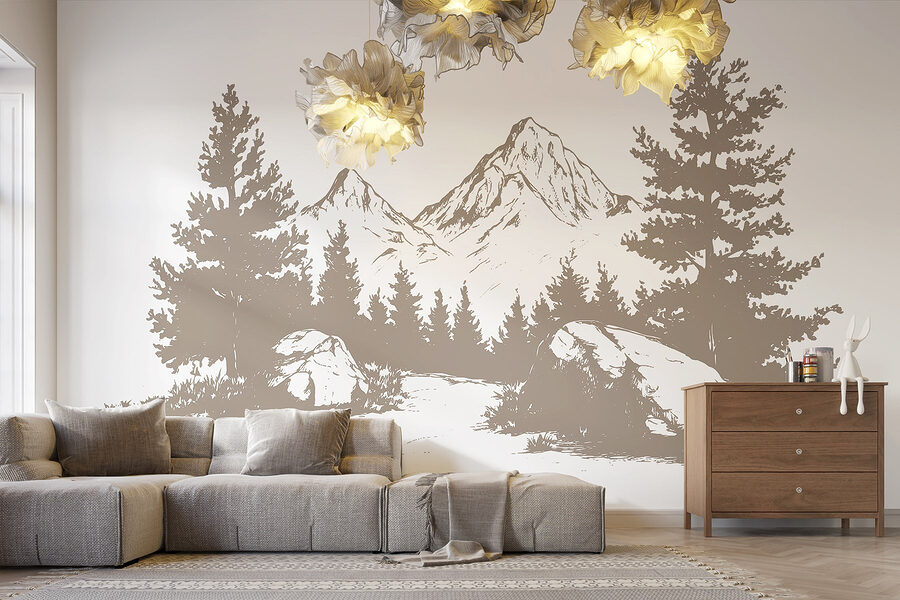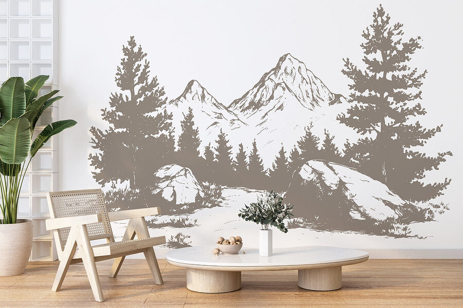 Verander elke ruimte in een gezellig toevluchtsoord met deze muurschildering met een serene bergketen omringd door majestueuze bomen en stevige rotsen. Stel je voor dat je ‘s ochtends aan je koffie nipt en het gevoel hebt dat je midden in de natuur zit zonder je huis te verlaten. Het brengt een kalme sfeer, perfect om tot rust te komen na een lange dag. De zachte, aardse tinten maken elke kamer gezelliger, waardoor het een ideale achtergrond is voor familiebijeenkomsten of rustige avonden met een boek. Bovendien is het een geweldige gespreksstarter – iedereen houdt van een goed uitzicht. Duik in de natuur en laat deze muurschildering je elke dag meenemen op een klein avontuur.