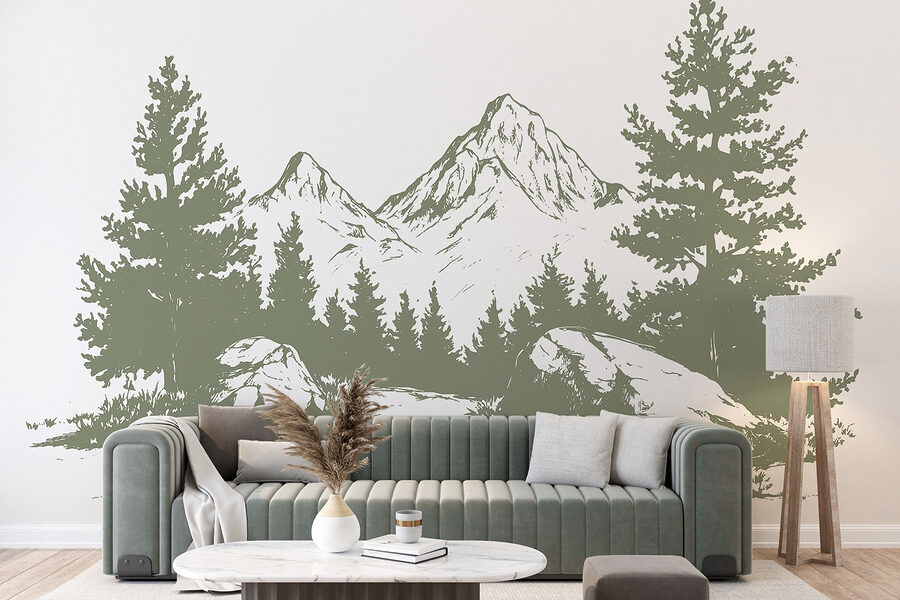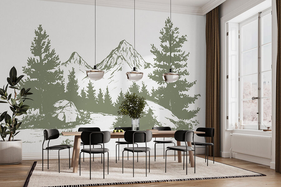 Verander elke ruimte in een rustige ontsnapping met deze muurschildering met een betoverend tafereel van bomen en bergen. Stel je voor dat je bij elke blik in een sereen bos stapt – het ene moment ben je in gedachten verzonken, het volgende moment ben je aan het dagdromen over een gezellig toevluchtsoord. De aardetinten passen prachtig bij elkaar en zorgen voor een kalme sfeer die ontspanning uitstraalt. Perfect voor een woonkamer, kantoor of zelfs een hoekje dat smeekt om een beetje charme. Het is alsof je een stukje natuur in huis haalt, zonder insectenspray. Wie zou er niet wakker willen worden met dit uitzicht?