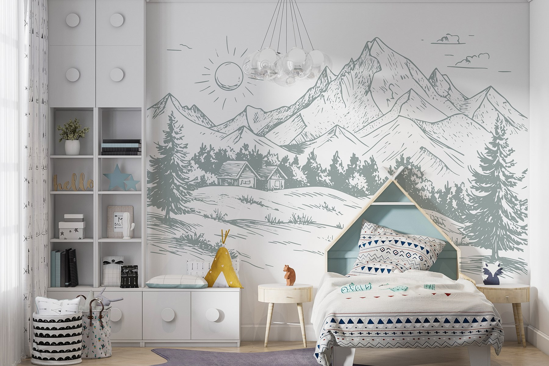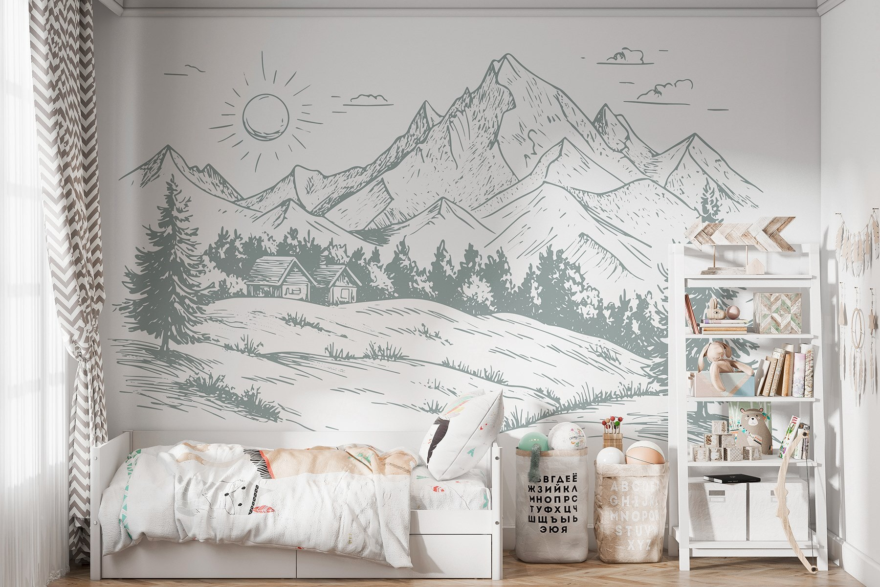 Verander elke ruimte in een serene ontsnapping met deze muurschildering met een prachtig landschap van bomen en majestueuze bergen. Stel je voor dat je wakker wordt met de zachte contouren van de natuur in je woon- of slaapkamer – het is elke dag net een minivakantie. De subtiele details en zachte lijnen creëren een rustgevende sfeer, perfect om te ontspannen na een lange dag of om creativiteit te inspireren. Stel je voor dat vrienden binnen komen wandelen en hun ogen oplichten als ze het frisse, buitenachtige gevoel in zich opnemen. Het is niet alleen decor; het is een frisse wind voor je muren!