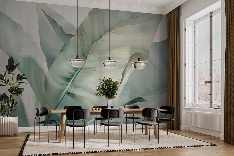 Een ruimte transformeren kan zo eenvoudig zijn als het uitrollen van weelderige bladeren in zachte tinten. Deze muurschildering is niet alleen voor de muren; het is alsof je een tropische vakantie in de woonkamer uitnodigt. Stel je voor dat je aan een drankje nipt, het levendige groen voorbij fladdert en dagdroomt over zonnige stranden – zonder zand in je schoenen. De zachte kleuren creëren een rustige sfeer, waardoor het perfect is voor een gezellige leeshoek of een chill hangplek. Bovendien lijkt het alsof je muur net een Instagram-waardig filter heeft gekregen! Wie wil er nou geen achtergrond die aanvoelt als een mini-vakantie?
