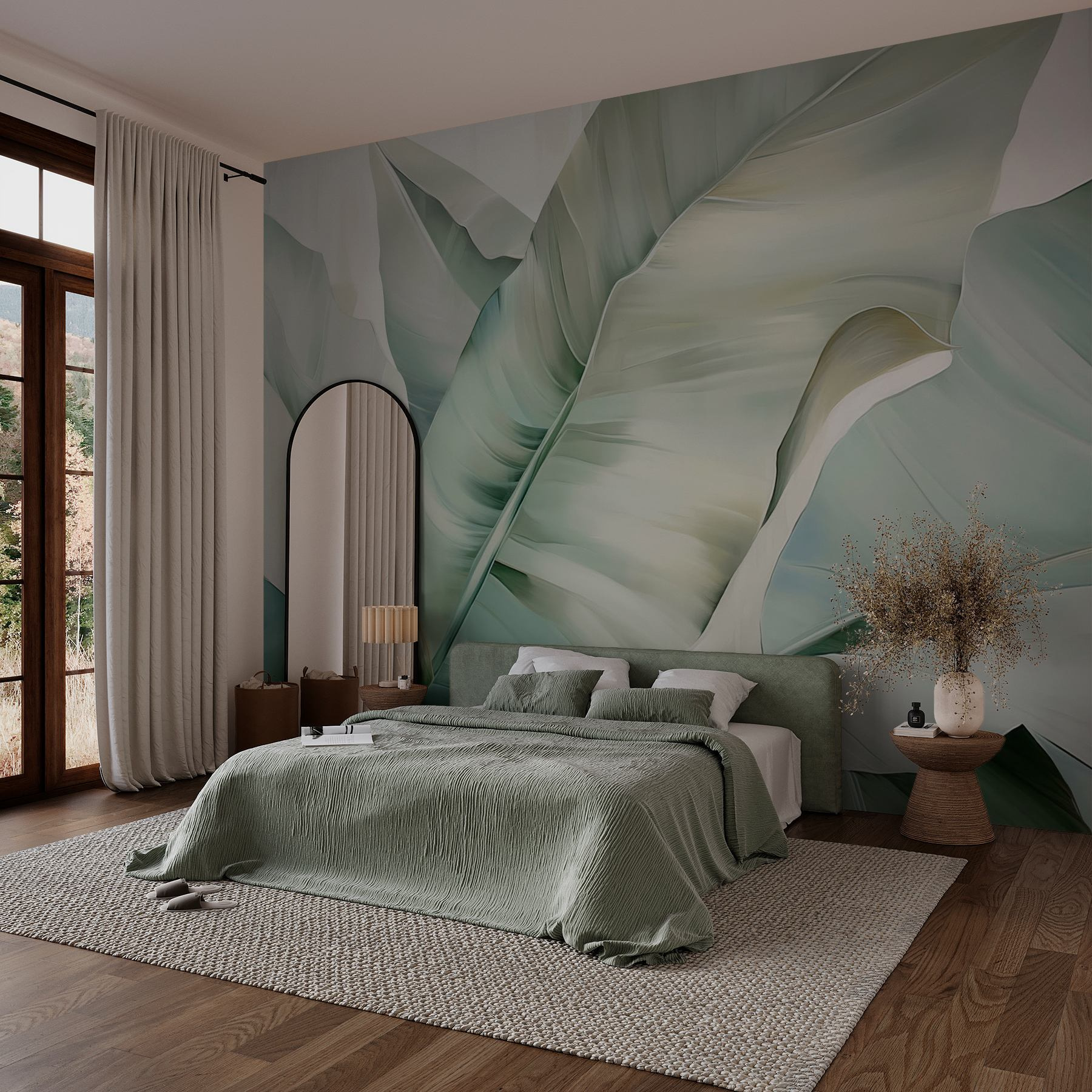 Een ruimte transformeren kan zo eenvoudig zijn als het uitrollen van weelderige bladeren in zachte tinten. Deze muurschildering is niet alleen voor de muren; het is alsof je een tropische vakantie in de woonkamer uitnodigt. Stel je voor dat je aan een drankje nipt, het levendige groen voorbij fladdert en dagdroomt over zonnige stranden – zonder zand in je schoenen. De zachte kleuren creëren een rustige sfeer, waardoor het perfect is voor een gezellige leeshoek of een chill hangplek. Bovendien lijkt het alsof je muur net een Instagram-waardig filter heeft gekregen! Wie wil er nou geen achtergrond die aanvoelt als een mini-vakantie?