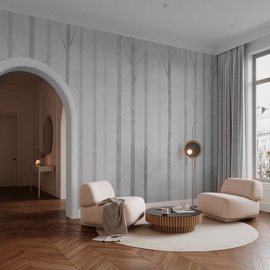 Stel je voor dat je een dromerig bos binnenstapt, gehuld in een zachte deken van mist. Deze muurschildering met een rustige groep bomen in de mist creëert een serene sfeer die moeilijk te weerstaan is. Het is perfect om een chille, op de natuur geïnspireerde toets toe te voegen aan elke kamer, zoals een gezellig uitje in een hut zonder het huis te verlaten. Zie het al voor je in een leeshoekje waar een dampende kop thee staat, of achter een comfortabele bank, uitnodigend voor luie middagen. De subtiele grijstinten houden de boel rustig, terwijl de bomen verhalen van boswandelingen fluisteren. Haal een stukje natuur in huis en laat elke blik een beetje rust en verwondering oproepen.