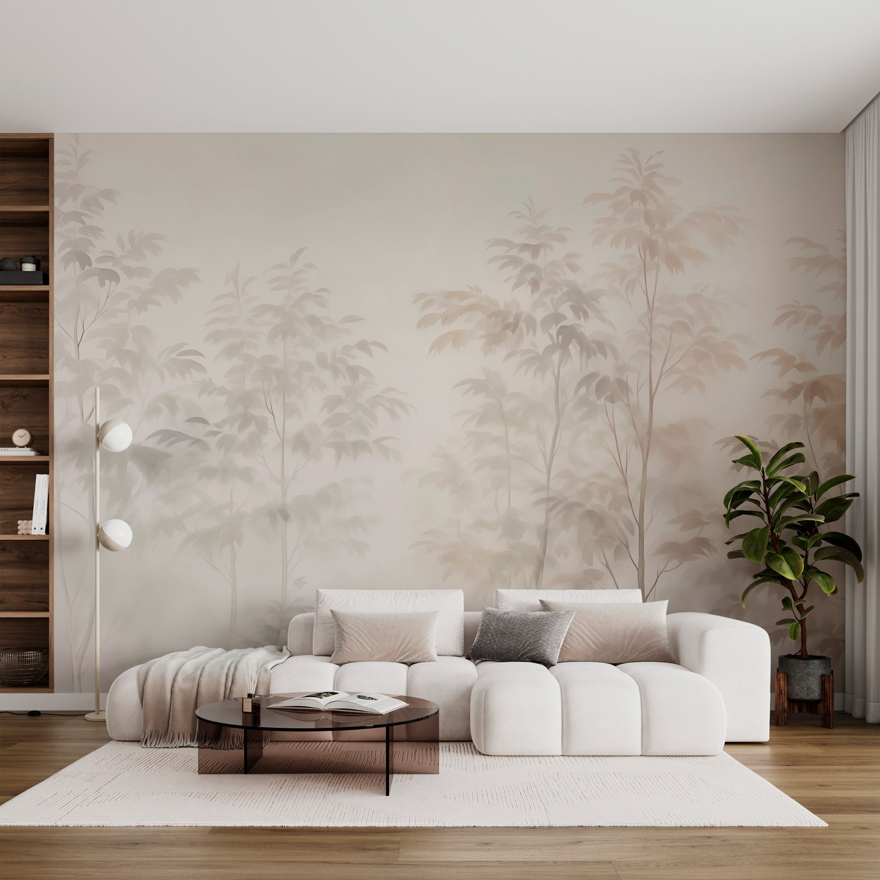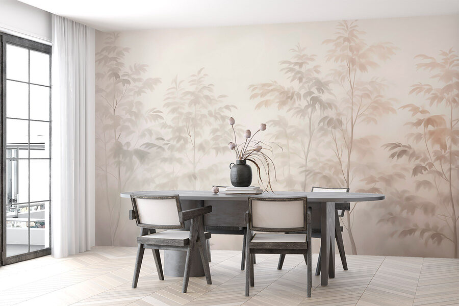 Tover een kamer om in een dromerige ontsnapping met de muurschildering Trees in the Fog. Stel je voor dat je wakker wordt in een vredig boslandschap, waar zachte silhouetten van bomen zachtjes vervagen in een mysterieuze mist. Het is net alsof je een stukje natuur op je muren hebt, dat uitnodigt tot kalmte en misschien zelfs een kopje koffie of thee in de hand. Perfect voor die rustige momenten waarop je even op adem wilt komen. Of het nu een gezellig leeshoekje is of een serene slaapkamer, deze muurschildering voegt een vleugje rust toe. Het is alsof je muur heeft besloten een wandeling in de mist te maken – wie zou daar niet van houden?