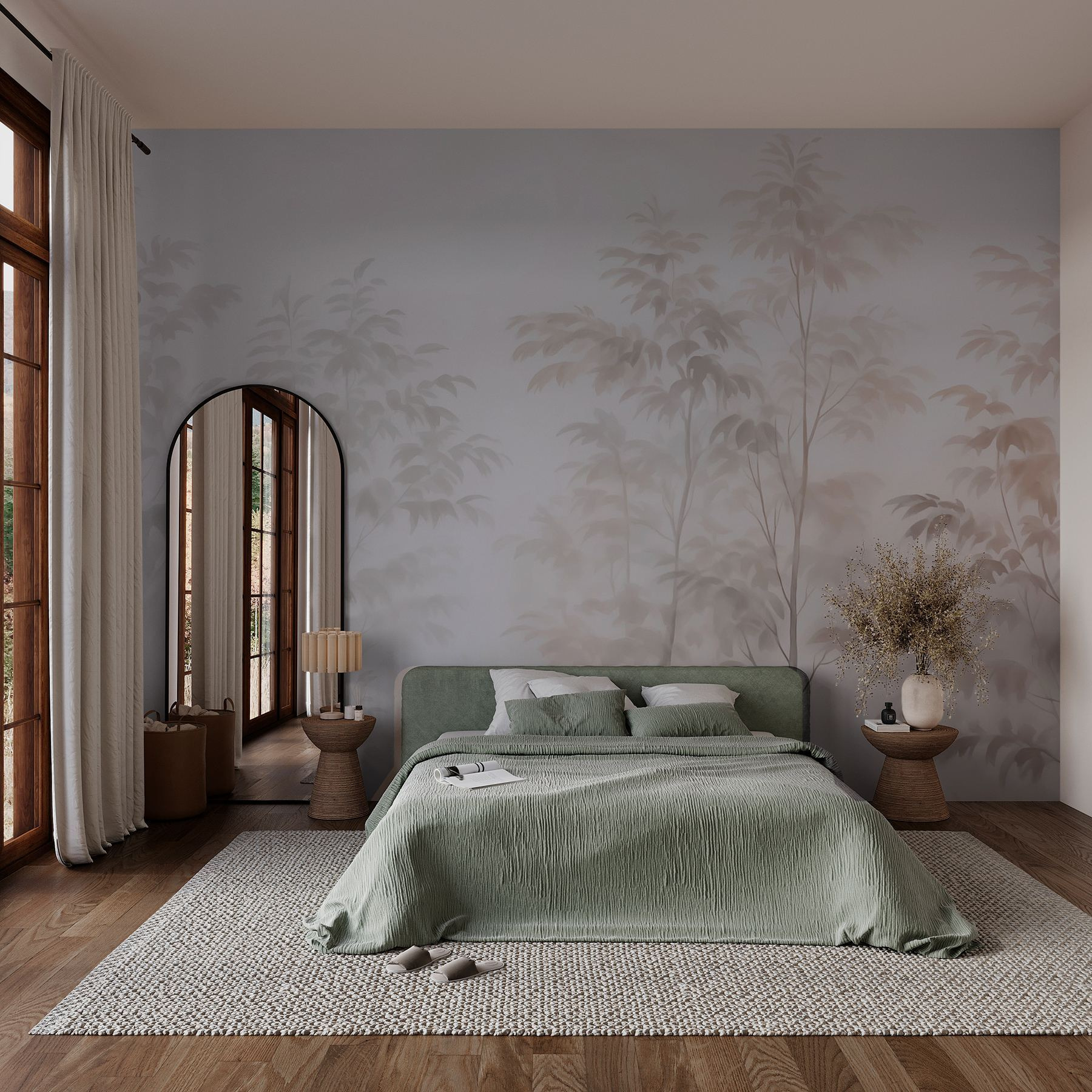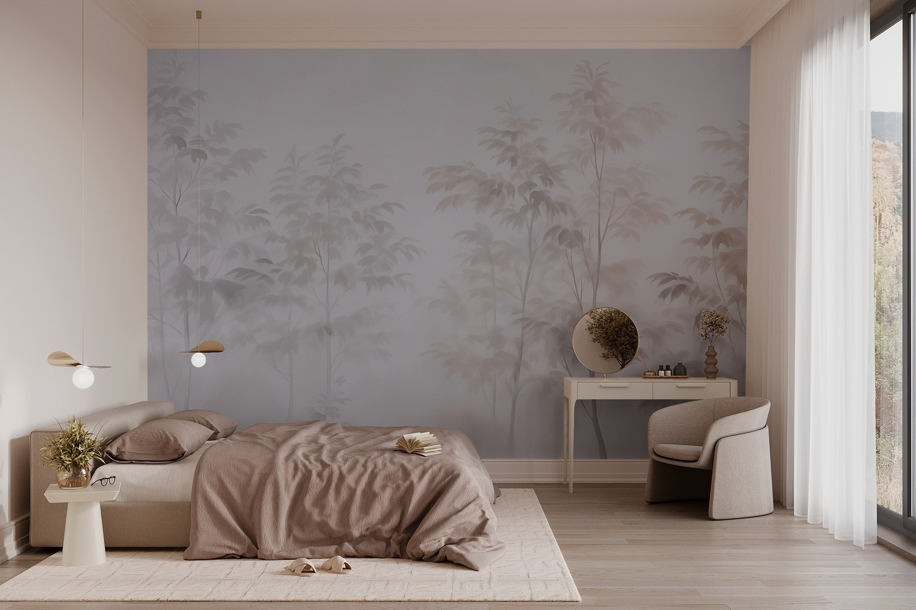 Transformeer je ruimte met “Trees in the Fog”, waar etherische silhouetten van bomen sierlijk samensmelten met zachte mist. Het is alsof je een vredig bos binnenstapt zonder je huis te verlaten. Stel je voor dat je koffie drinkt terwijl je naar dit zachte tafereel staart – het is rustgevend, bijna meditatief. De gedempte tinten creëren een rustgevende achtergrond, perfect voor woonkamers of knusse hoekjes. Vrienden zouden kunnen zeggen dat het aanvoelt als een mysterieuze droom, een geheim bos dat zich op slechts een muur verbergt! Haal een stukje natuur in huis en voel je zorgen vervagen in de mist. Voeg comfortabele kussens toe en misschien een goed boek.