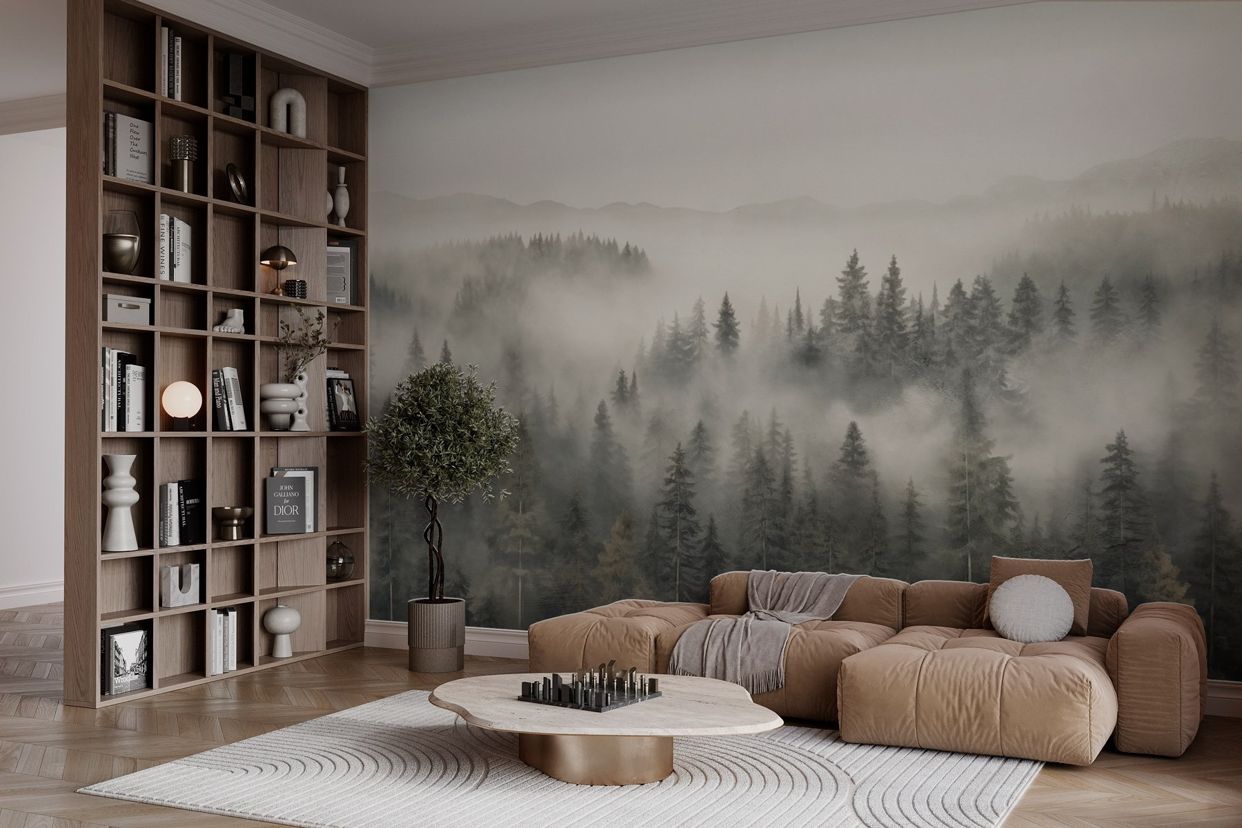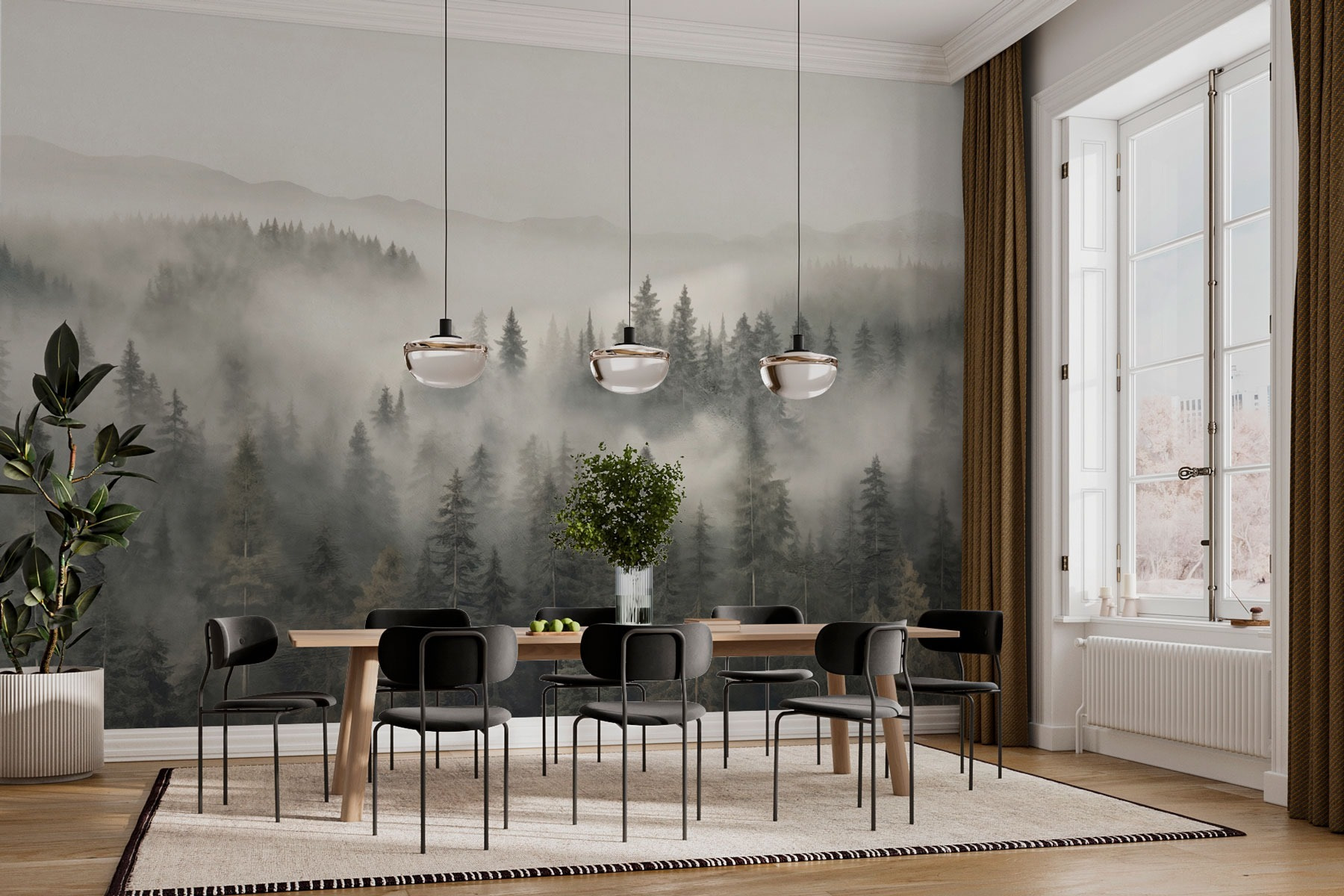 Tover je ruimte om in een dromerige ontsnapping met deze prachtige muurschildering van een bos gehuld in mist en bergen. Het is alsof je een rustig bos binnenstapt waar de tijd stilstaat. Stel je voor dat je ‘s ochtends aan je koffie nipt terwijl je naar deze serene bomen staart, terwijl je voelt hoe de natuur je omarmt. Er is iets magisch aan de mist die alles zachter maakt, nietwaar? Deze muurschildering is perfect voor woonkamers, kantoren of zelfs koffiehoekjes en creëert een vredige sfeer. Laat je muren verhalen vertellen van ochtendwandelingen en gefluisterde briesjes, en verander elke kamer in een gezellig toevluchtsoord.