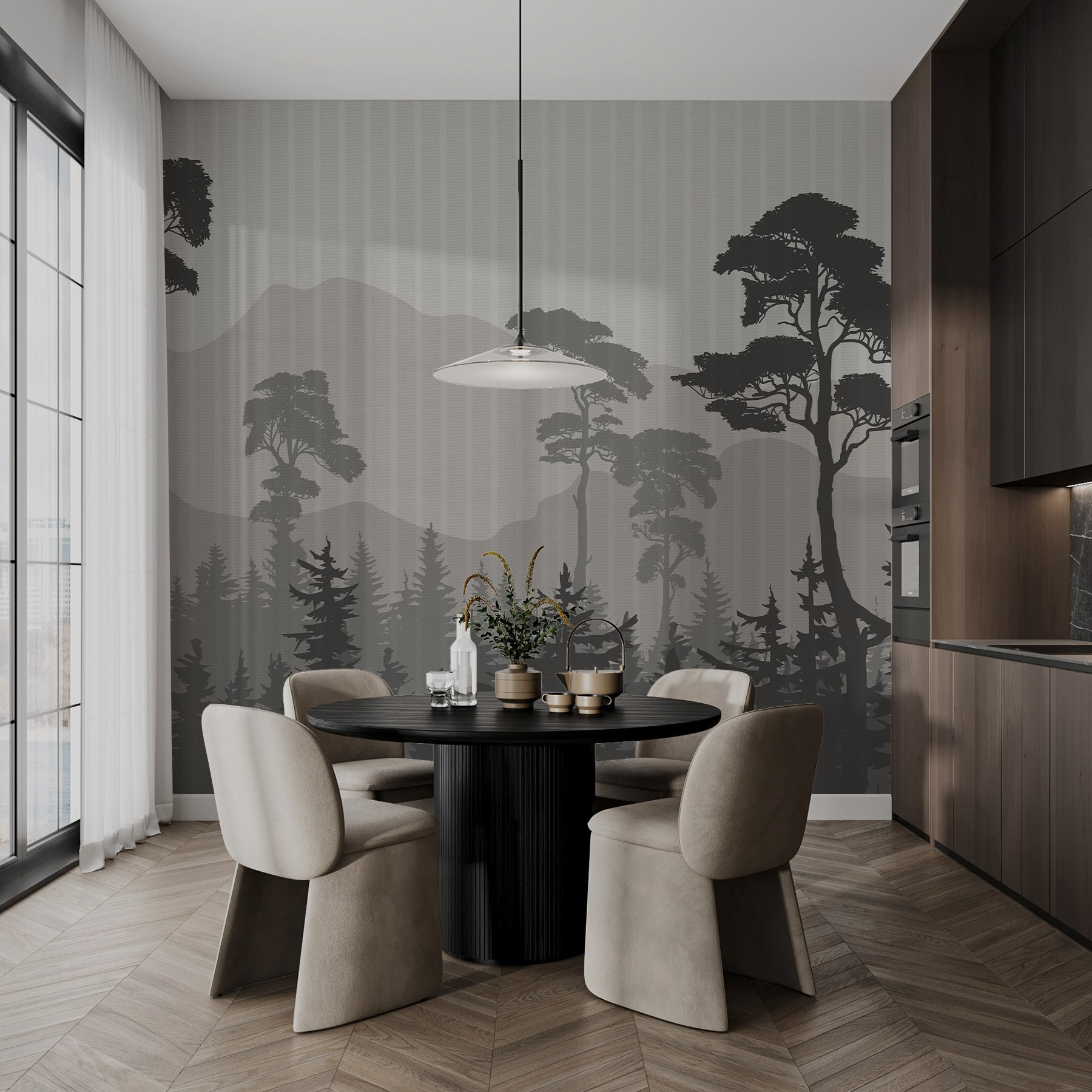 Transformeer je ruimte met deze prachtige muurschildering met een adembenemend landschap van bomen en bergen. Stel je voor dat je elke dag wakker wordt met de serene silhouetten van torenhoge dennenbomen tegen glooiende heuvels, die de perfecte achtergrond vormen voor ontspanning. Het is alsof je de natuur in je woonkamer hebt, zonder de insecten en het weer. Deze muurschildering brengt een aardse sfeer, aardt je ruimte en voegt een vleugje verfijning toe. Stel je een gezellige avond voor met zachte verlichting, misschien een boek in de hand en dat prachtige tafereel dat precies het juiste vleugje rust toevoegt. Maak je klaar om te genieten van het buitenleven, allemaal vanuit het comfort van thuis!