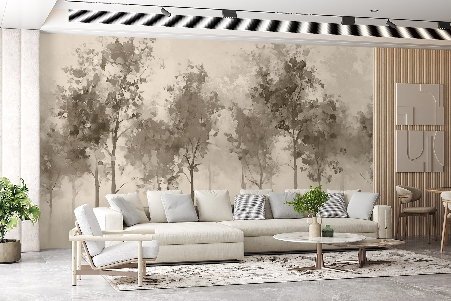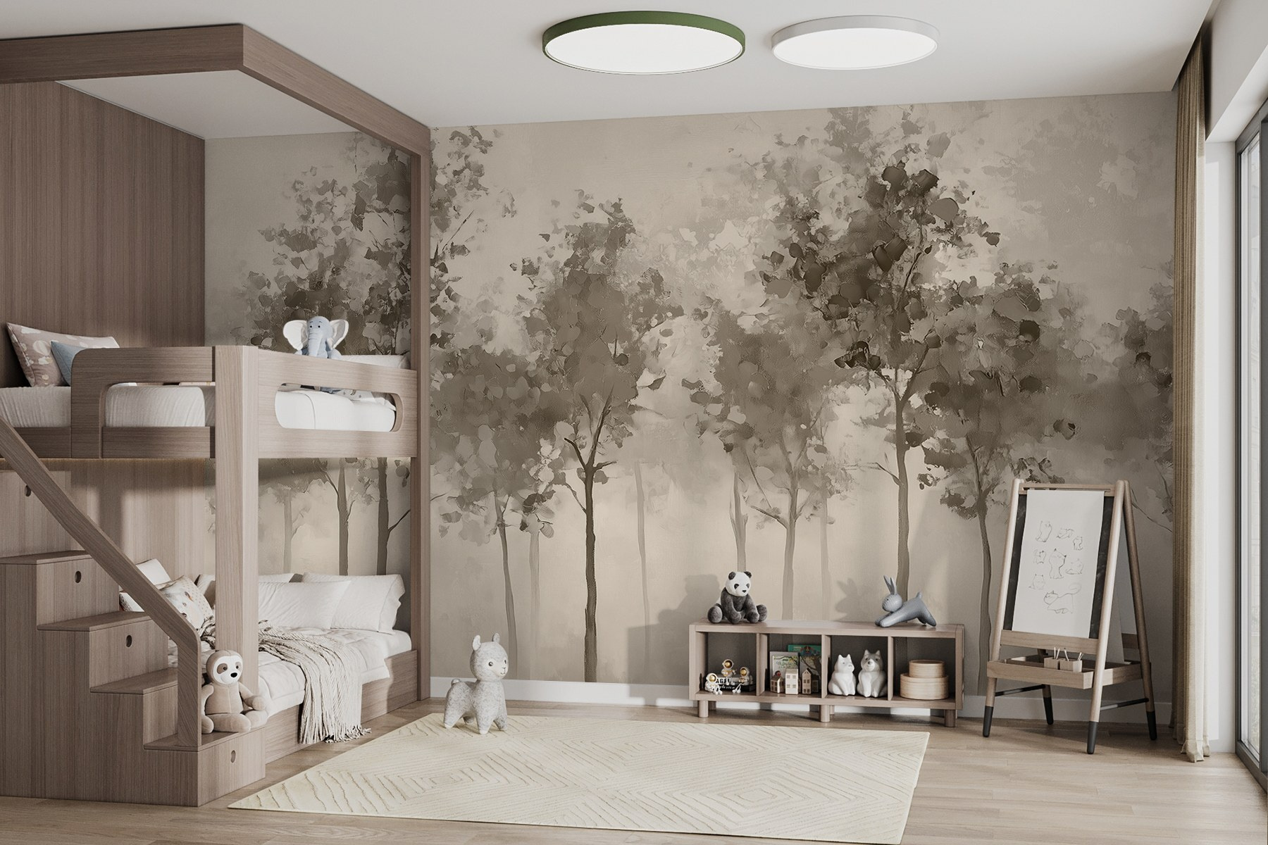 Tover elke kamer om in een sereen toevluchtsoord met deze betoverende muurschildering met bomen gehuld in zachte mist. Stel je voor dat je ‘s ochtends aan je koffie nipt terwijl je verdwaalt in de kalme, gedempte tinten die zoete woordjes uit de natuur lijken te fluisteren. Het is alsof je een vredig bos in je woonruimte brengt. Deze muurschildering is niet alleen decor; het is een sfeerbooster. Perfect voor wie een vleugje rust wil zonder al die bladeren en beestjes in huis. Plus, wie houdt er niet van om zich een beetje in een dromerig toevluchtsoord in het bos te wanen?