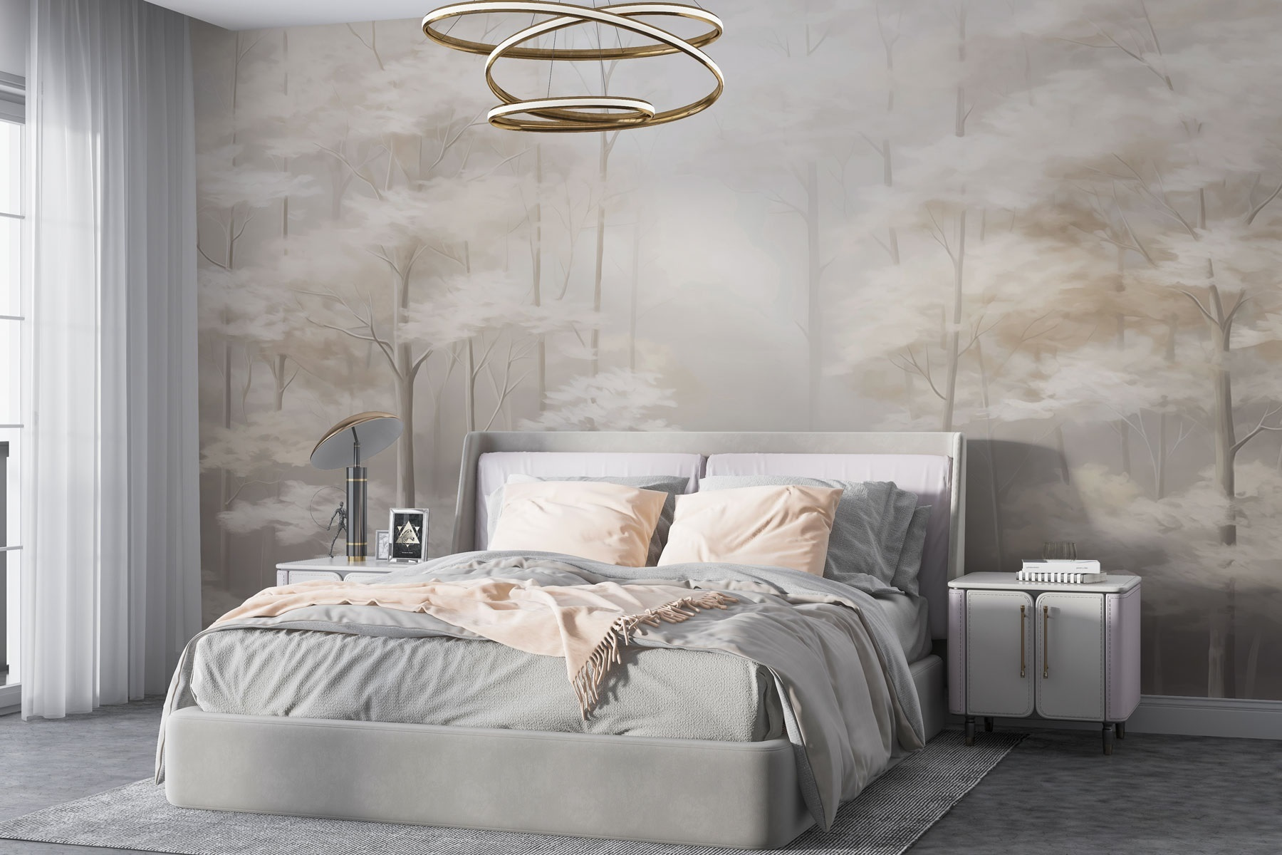 Stel je voor dat je een dromerig mistig bos binnenstapt, waar zachte tinten en zachte bomen je uitnodigen om rond te dwalen. Deze muurschildering is als een frisse wind voor je kamer – een perfecte mix van de rust van de natuur en moderne kunst. Stel je gezellige avonden voor in een kamer die is getransformeerd door deze serene achtergrond. Het is niet zomaar een muurschildering; het is een stemming. Of je nu koffie drinkt of aan je laatste project werkt, dit rustgevende tafereel belooft je geest te kalmeren en inspiratie op te wekken. Bovendien is het een geweldige gespreksstarter voor al je gasten. Wie wil er nu niet thuis over de schoonheid van de natuur praten?