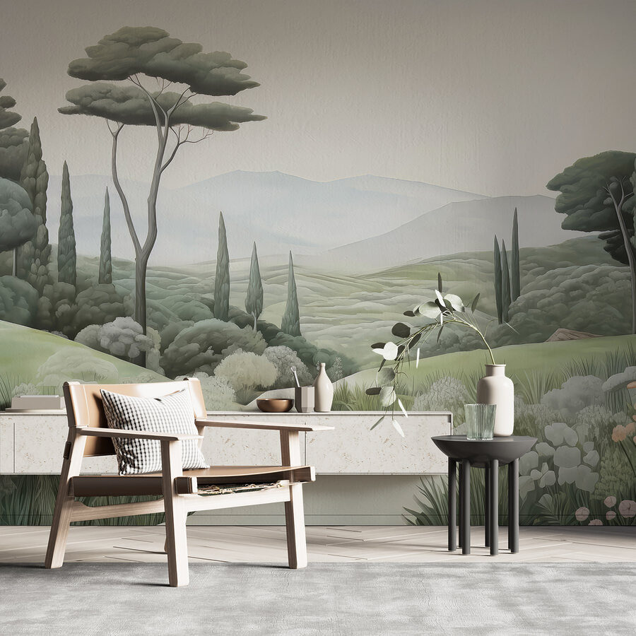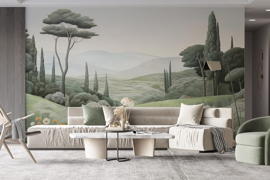 Transformeer je ruimte met deze betoverende muurschildering met een sereen landschap, compleet met een kronkelend pad en sierlijke bomen. Stel je voor dat je in een vredige ontsnapping stapt telkens als je de kamer binnenloopt. De zachte groentinten en het gefluister van de natuur nodigen uit tot een gevoel van kalmte, perfect voor die gezellige avonden waarop tot rust komen essentieel is.