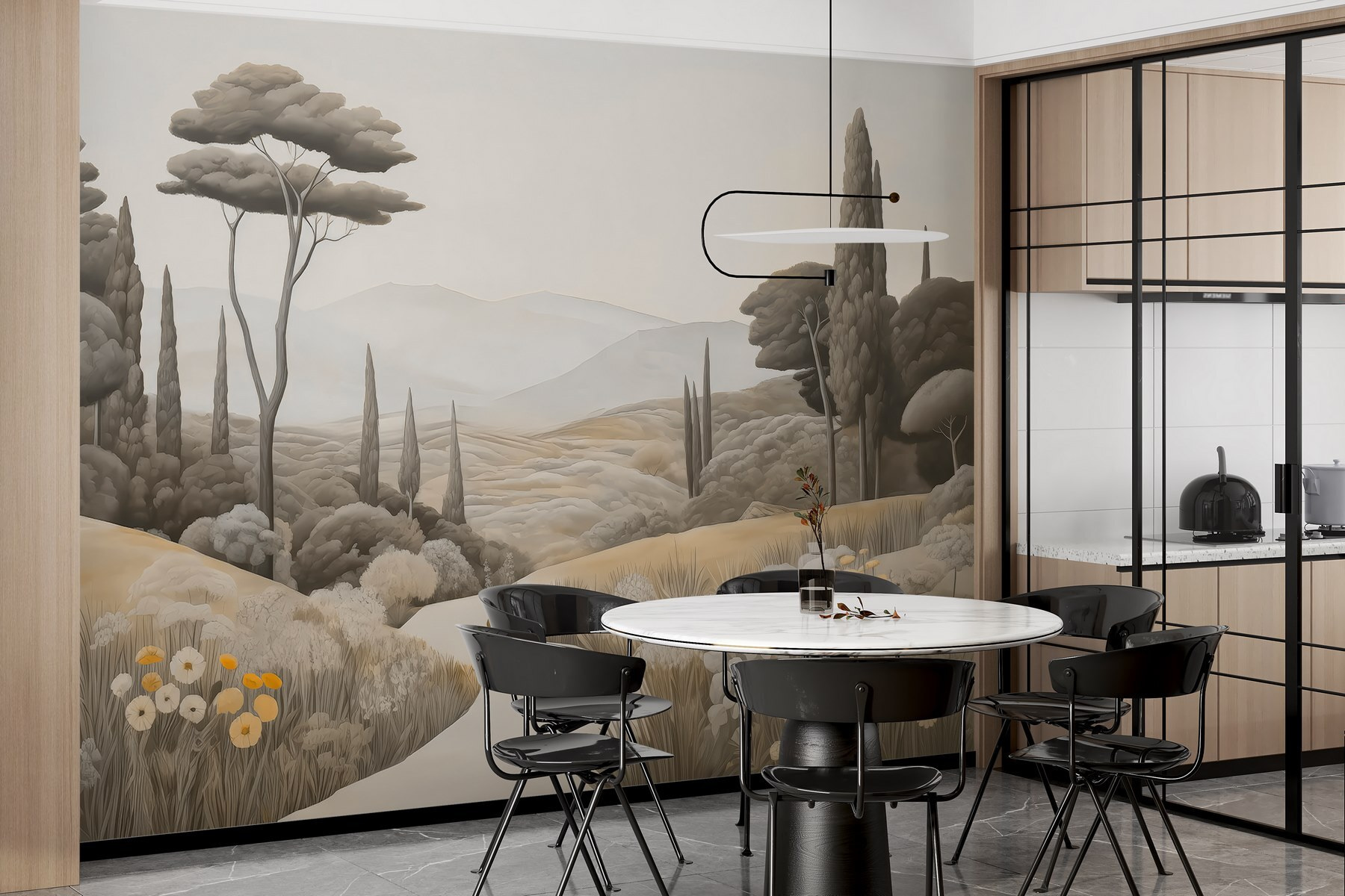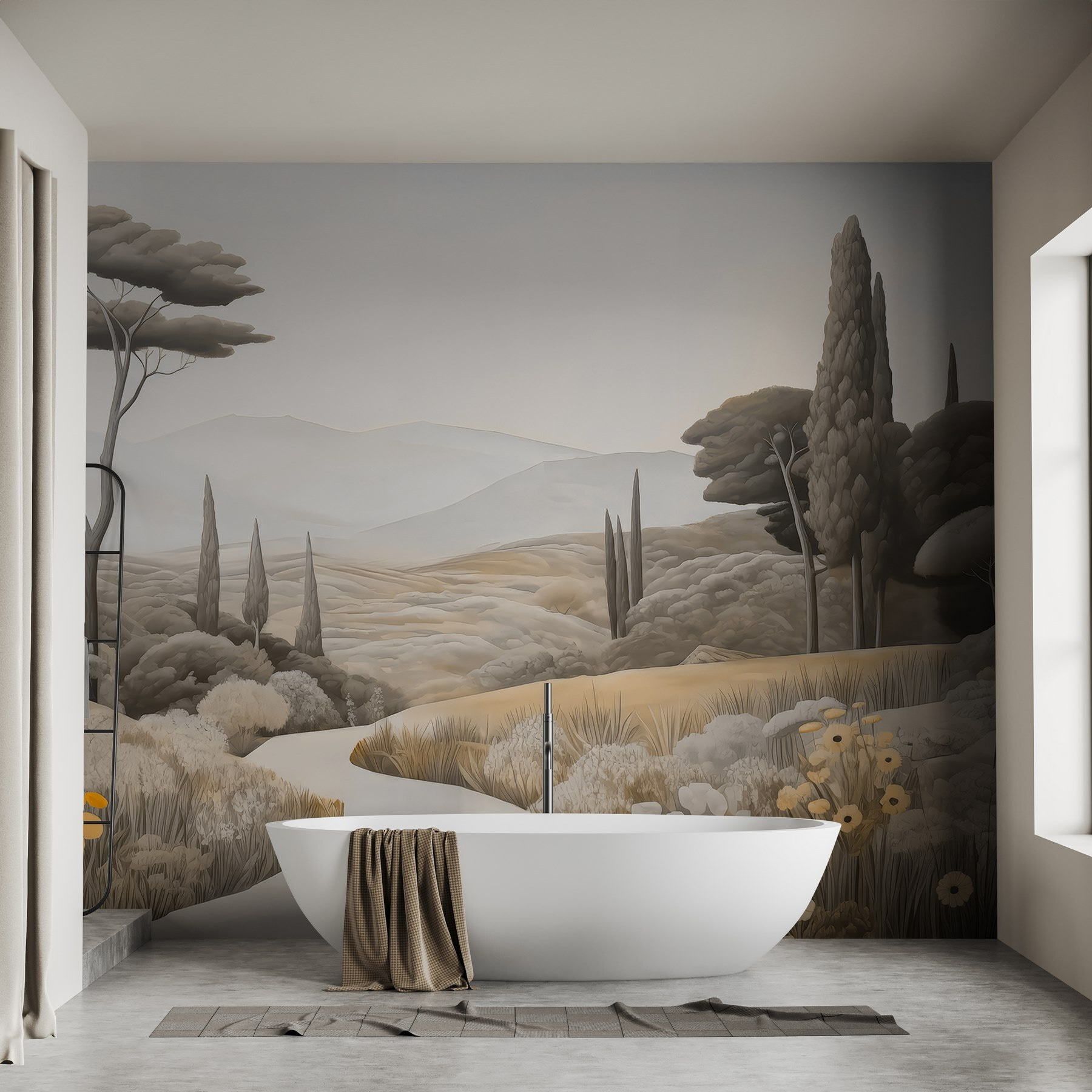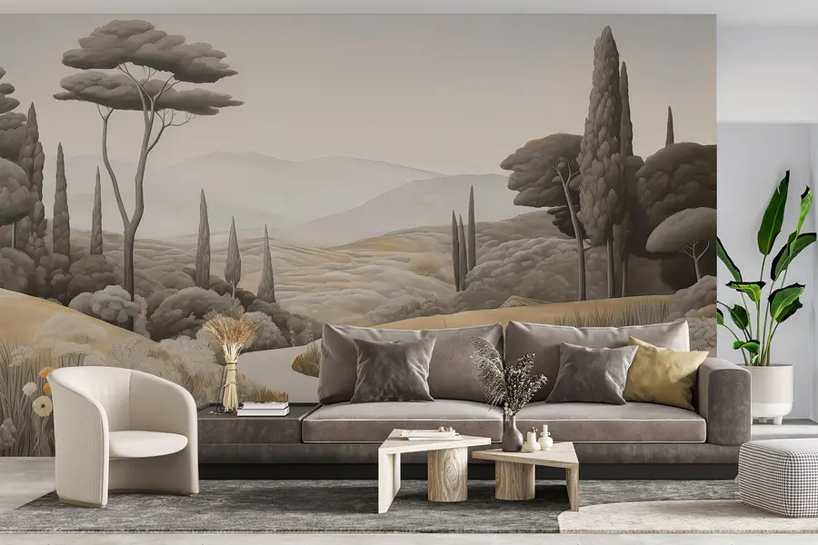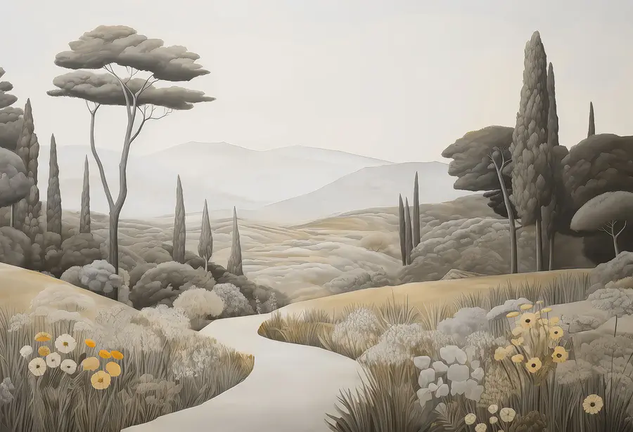 Transformeer je ruimte met deze prachtige muurschildering, “Landschap met een kronkelige weg en bomen”. De muurschildering brengt een sereen landschap tot leven en nodigt de natuur uit om naar binnen te komen zonder de rommel van het buitenleven. Stel je voor dat je op een luie zondag aan je koffie nipt terwijl je naar de glooiende heuvels en wuivende bomen staart – het is net een mini-vakantie aan je muur. Deze muurschildering is perfect voor die dromerige momenten en hult je kamer in warme, aardse tinten en zachte details die je zin geven om diep adem te halen. Het fluistert ontspanning en doet je denken aan vredige wandelingen onder een open hemel. Stel je de gesprekken voor die dit zou kunnen ontketenen of de rustige sfeer die het met zich meebrengt – wat een lieflijk accent voor elk hoekje!