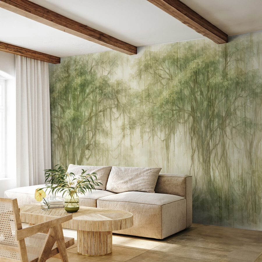 Dompel je ruimte onder in rust met deze betoverende muurschildering van een mistig bos. Het is alsof je in een droom stapt waar bomen geheimen fluisteren en de lucht dik is van mysterie. Stel je voor dat je ‘s ochtends aan je koffie nipt, omringd door de zachte tinten groen en bruin, terwijl het zonlicht door de mistige takken schijnt. Deze muurschildering voegt een vleugje rust van de natuur toe, waardoor zelfs de drukste dagen een beetje langzamer aanvoelen. Perfect voor een gezellige woonkamer of een serene slaapkamer, het nodigt uit tot dagdromen en blijft perfect onbewogen. Wie wil er nu geen serene vakantie thuis?