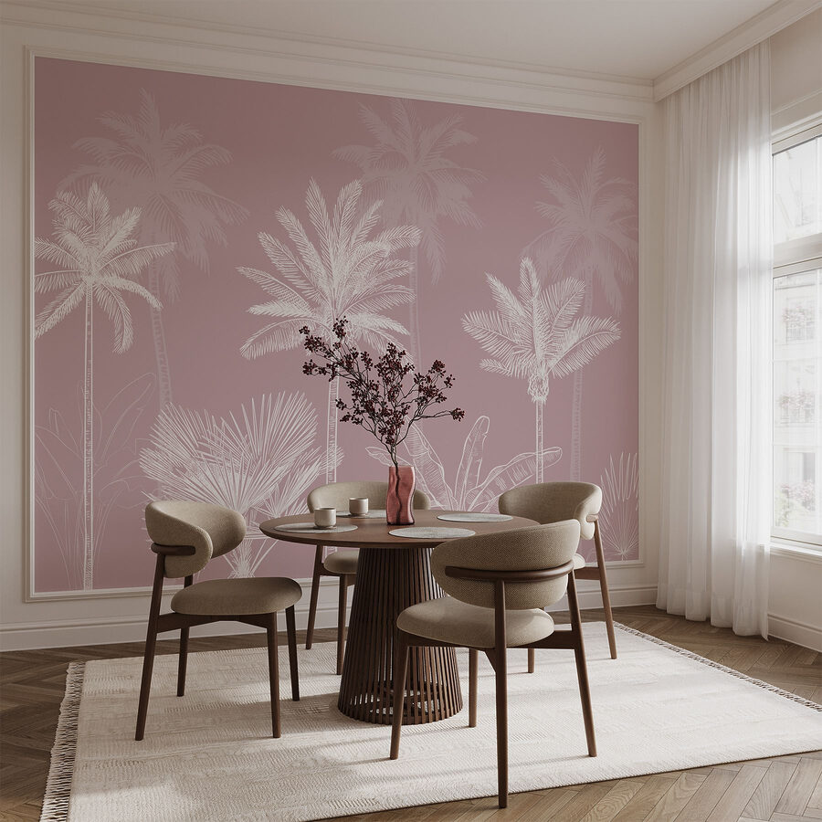 Transformeer elke kamer met deze charmante muurschildering “Groep Palmbomen”. Stel je voor dat je in een sereen tropisch oord stapt telkens als je je kamer binnenkomt. De zachte, gedempte roze achtergrond nodigt uit tot een gezellige sfeer, waardoor het een perfecte achtergrond is voor een ontspannen avond na een lange dag. Het is alsof je appartement plotseling een oceaanbriesje heeft – zonder het zand in je schoenen. Die ingewikkeld getekende palmen voegen een vleugje elegantie toe, maar ze nemen zichzelf niet al te serieus. Van de woonkamer tot een thuiskantoor, het is een speelse knipoog naar de natuur die muren levendig maakt. Perfect om bij weg te dromen!