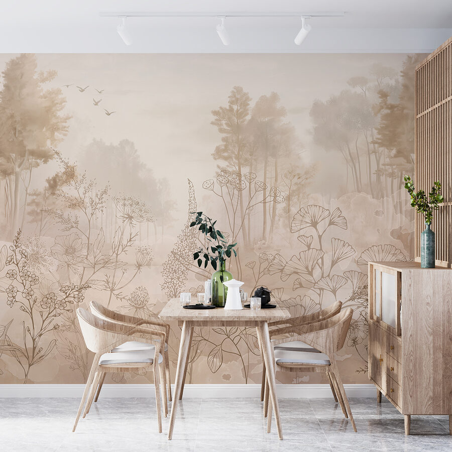 Deze muurschildering valt onder Populaire muurschilderingen, Natuur, Houtlook en Houtmuurschilderingen – kortom, het is een superster. De zachte bomen en piekerige bloemen kunnen je de drukte buiten doen vergeten. Ideaal voor een slaapkamer of woonkamer wanneer je tot rust wilt komen. Bovendien passen die subtiele kleuren overal bij, dus geen zorgen over botsingen met je inrichting. Stel je voor: een kopje thee, een comfortabele stoel en deze prachtige muurschildering die de sfeer bepaalt. Bliss!