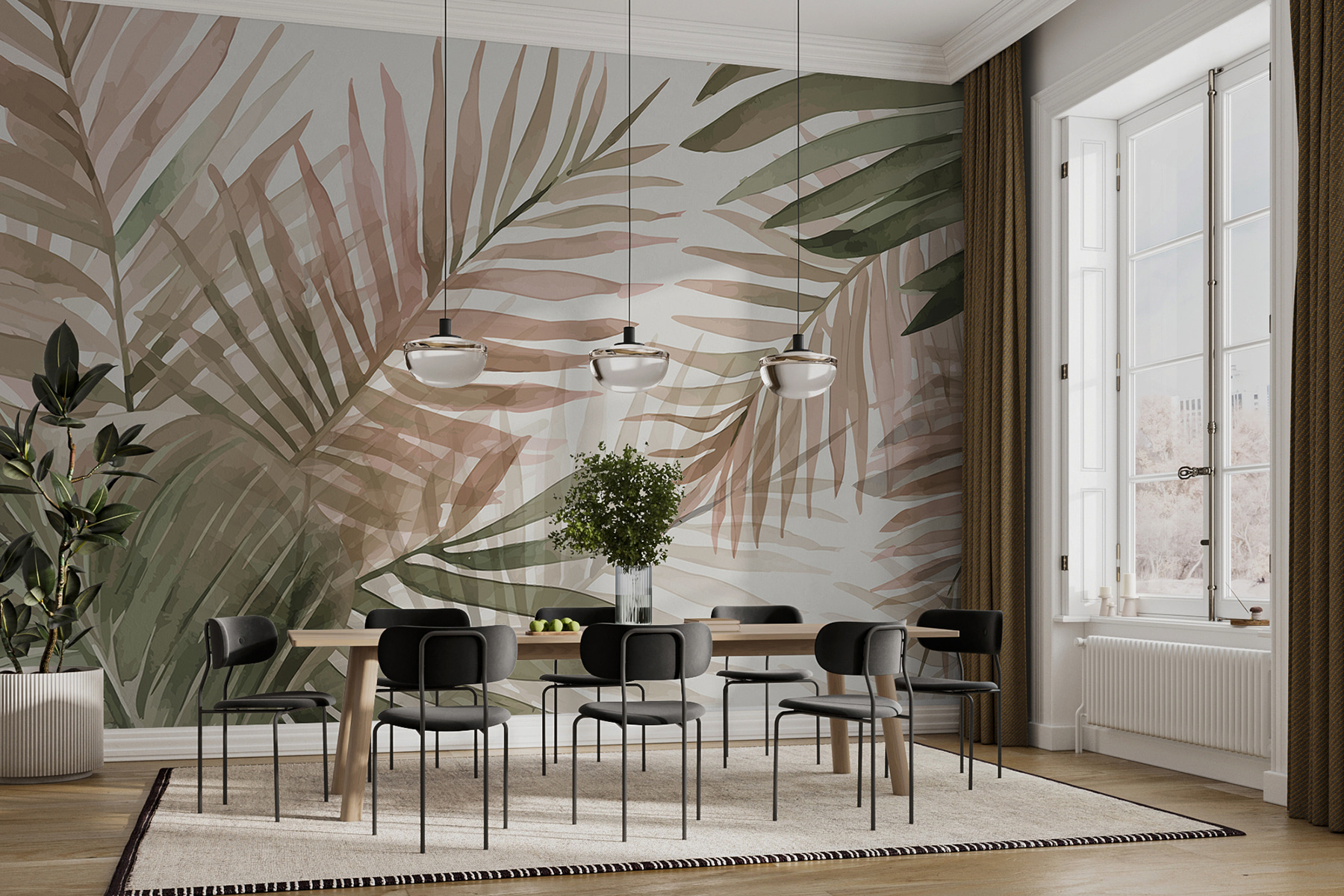 Soms is het fijn om een ruimte te hebben die “kalmte” fluistert als het leven een beetje te lawaaierig is. Deze muurschildering doet precies dat. Je krijgt zin om achterover te leunen, een fruitig slokje te nemen en te dromen van met palmbomen omzoomde stranden. Als je huis je toevluchtsoord is, is deze muurschildering misschien net de frisse wind die je nodig hebt. 🍃