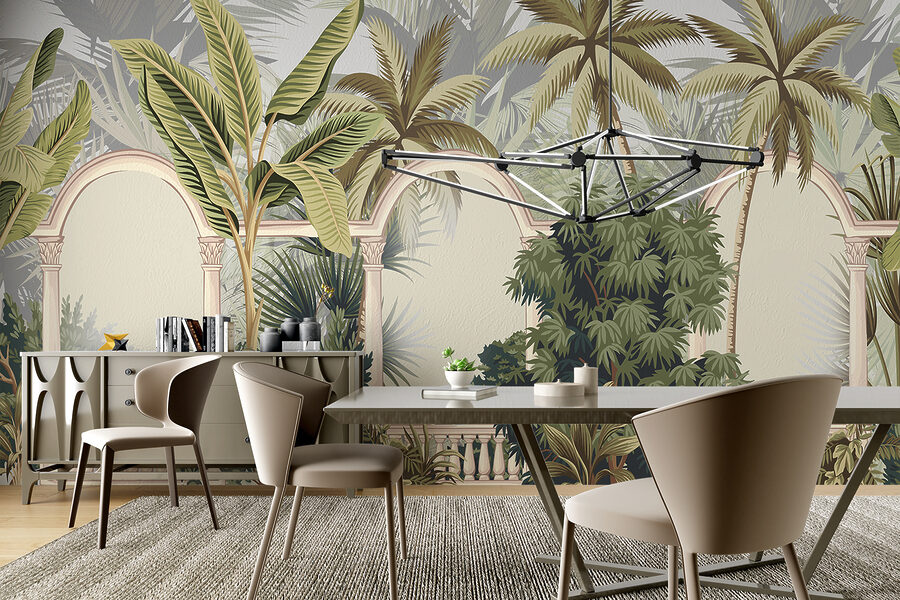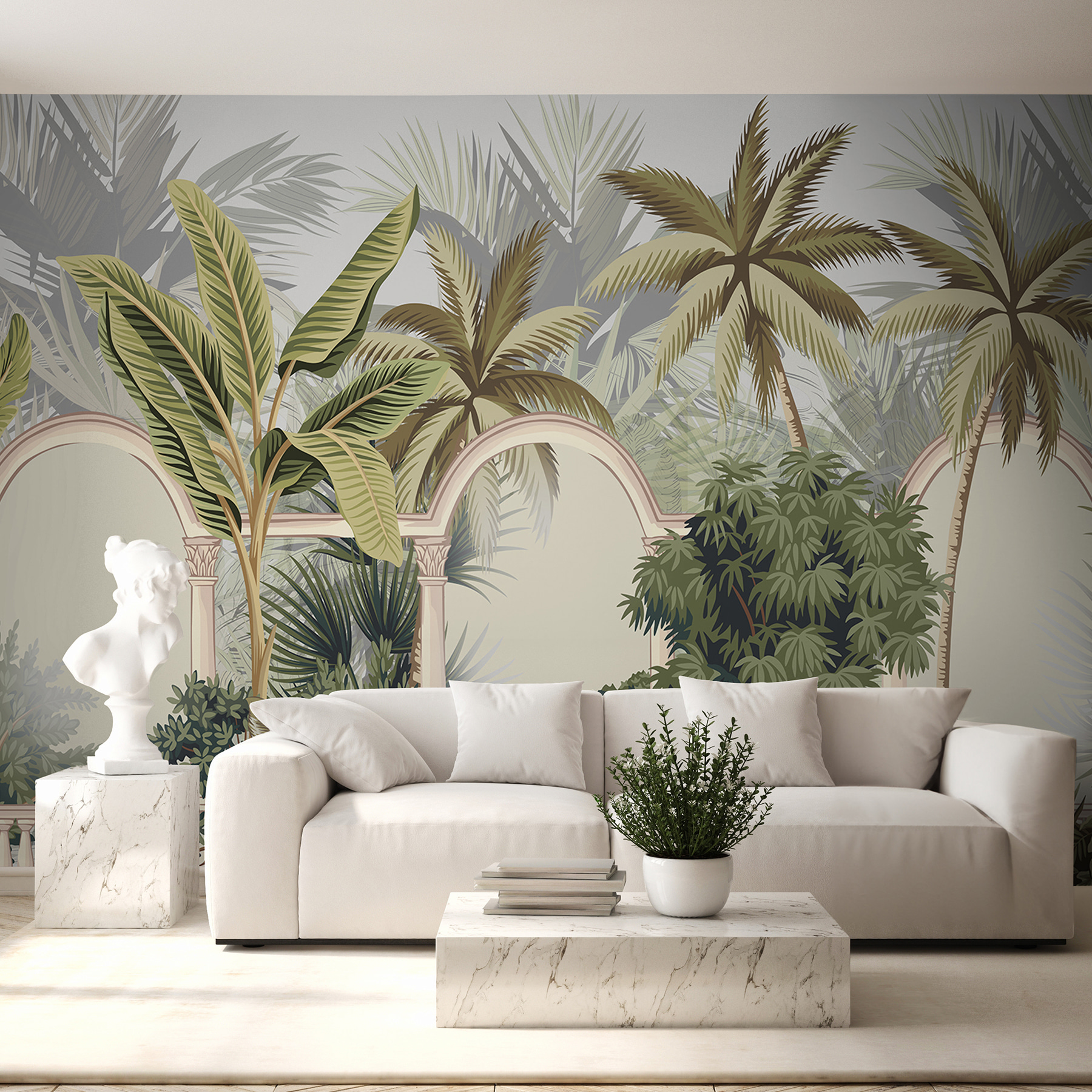 Stel je voor dat je je kamer binnenloopt en het gevoel hebt dat je in een serene tropische oase bent beland. Deze muurschildering, met zijn sierlijke palmbomen die zachtjes wiegen tegen elegante bogen, creëert die sfeer moeiteloos. Het is als je eigen kleine ontsnapping – een venster naar een weelderige jungle zonder dat je je huis hoeft te verlaten. Perfect om een vleugje natuur en een vleugje avontuur aan je interieur toe te voegen. Wie wist dat een muur je ticket naar het paradijs kon zijn? Voeg er een comfortabele zithoek aan toe en je zou wel eens kunnen wegdromen van eilandbriesjes.