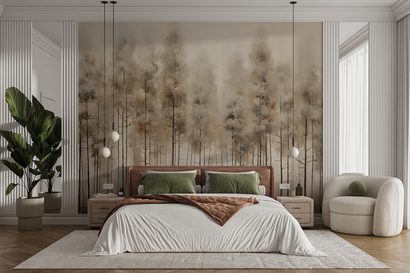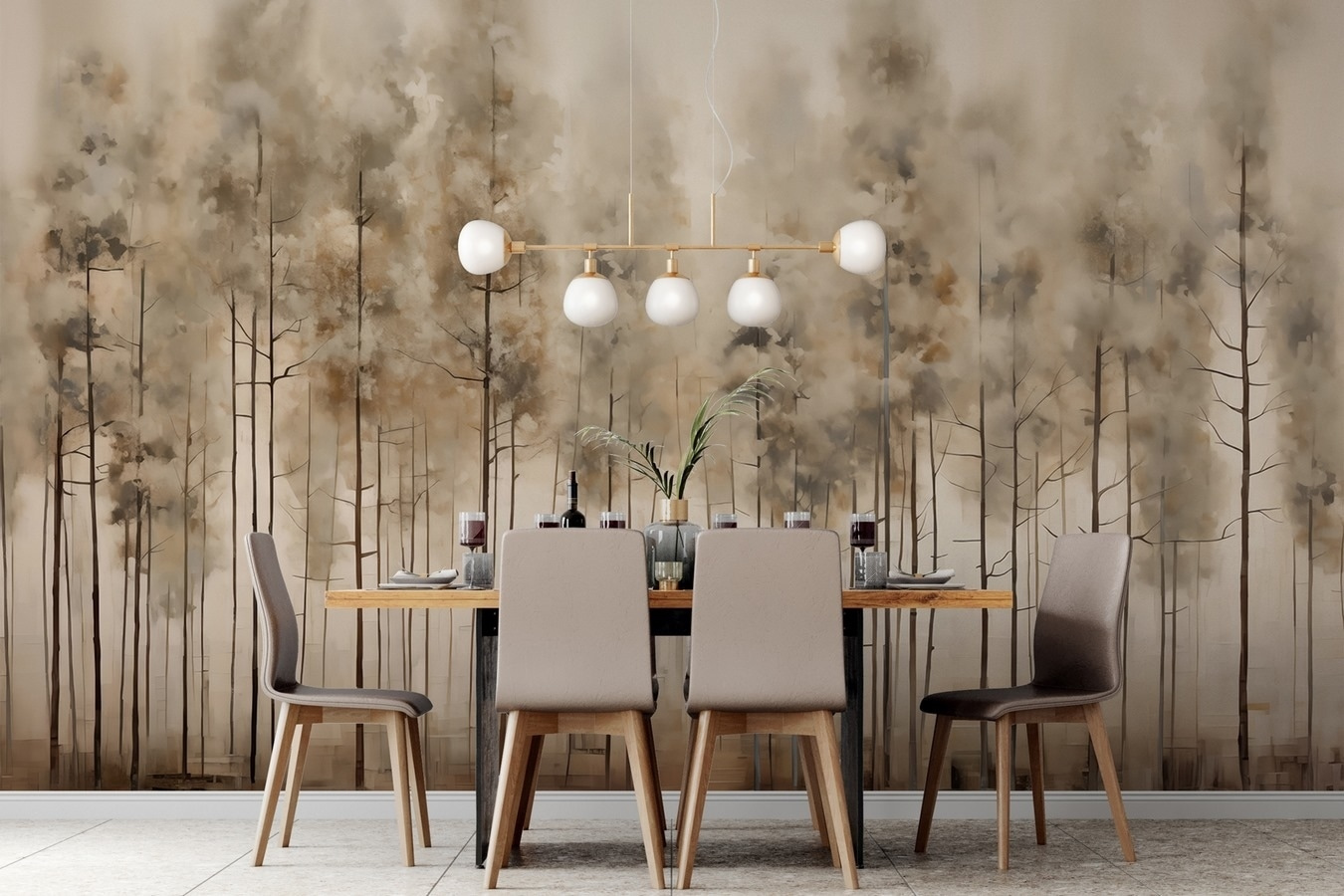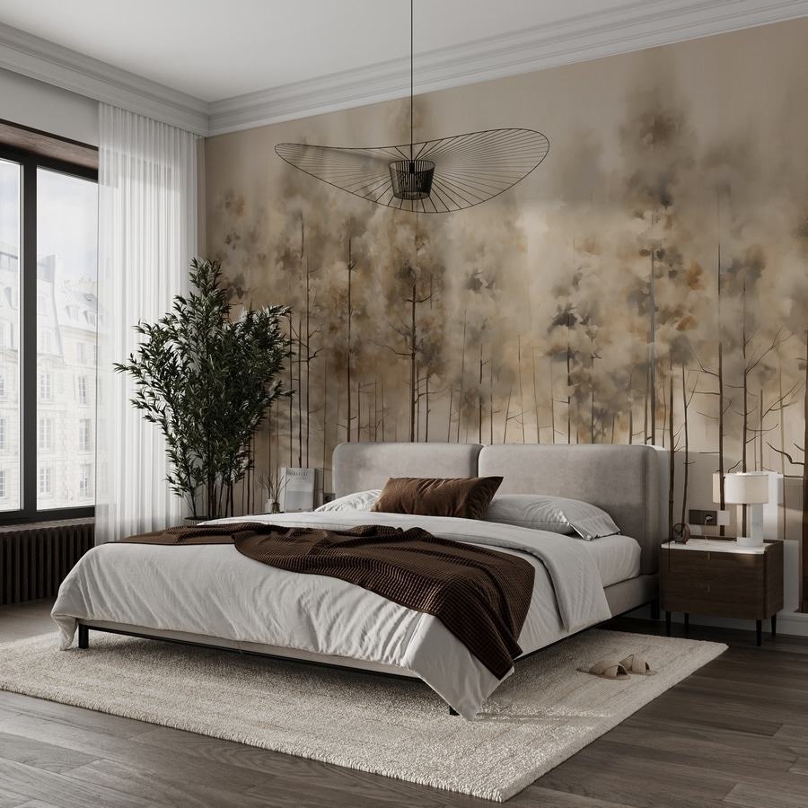 Stel je voor dat je een zacht bos binnenstapt, waar de lucht fris aanvoelt en de wereld wegsmelt. Deze muurschildering met een serene groep bomen brengt die rustgevende sfeer je kamer binnen. De zachte, aardse tinten creëren een uitnodigende sfeer, perfect voor gezellige avonden met een goed boek of zelfs voor ontspannen bijeenkomsten. Zie het al voor je in een woonkamer of slaapkamer, waarbij je de muren verandert in ramen naar de natuur, waardoor het gewone buitengewoon aanvoelt. Het is alsof je een stukje buiten hebt, zonder de insecten. Verfris je ruimte met een vleugje rust en laat deze muurschildering zoete notities van de natuur je huis binnen fluisteren.