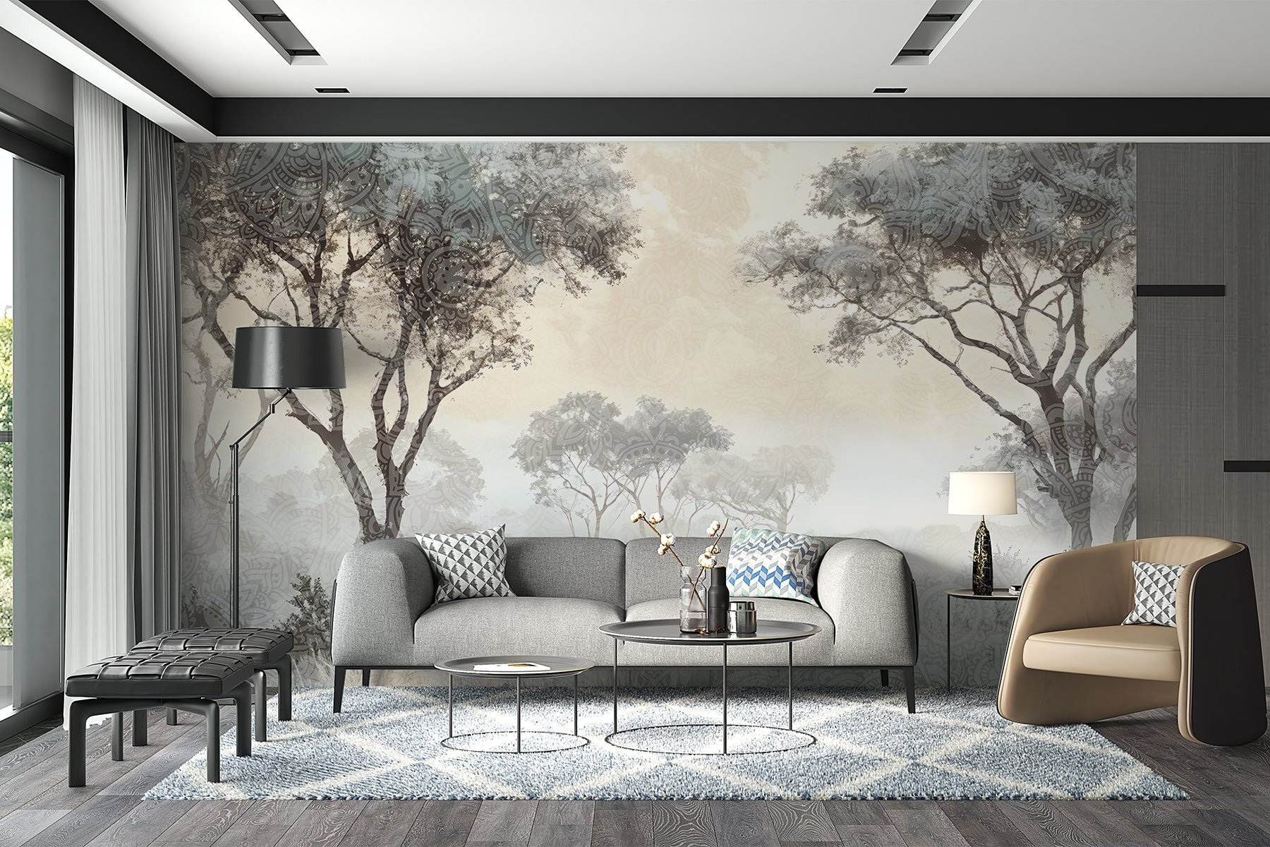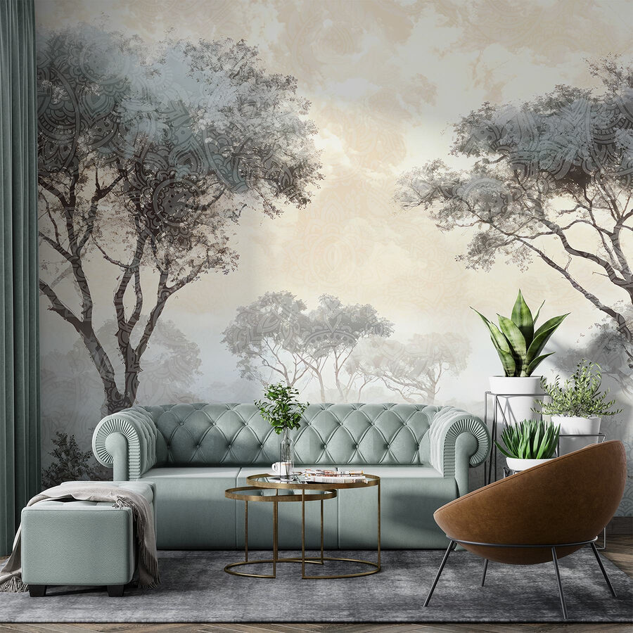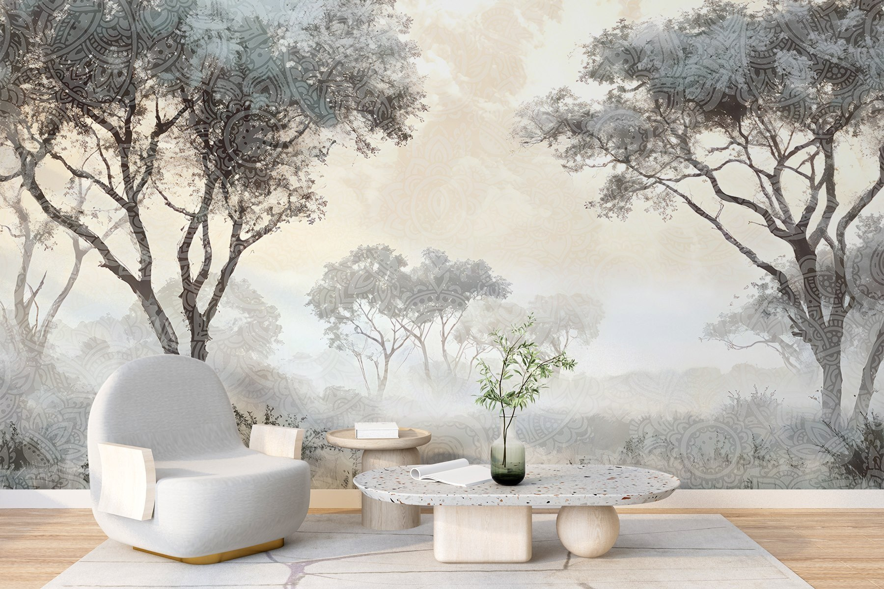 Verander elke kamer in een serene ontsnapping met deze muurschildering “Mistig landschap met bomen en planten”. Stel je voor dat je een dromerig bos binnenstapt, waar ochtendmist hoge bomen en zachte planten omhult. Het is alsof je een stukje natuur naar binnen haalt – perfect om een rustig leeshoekje te creëren of een knus hoekje voor een gesprek van hart tot hart.