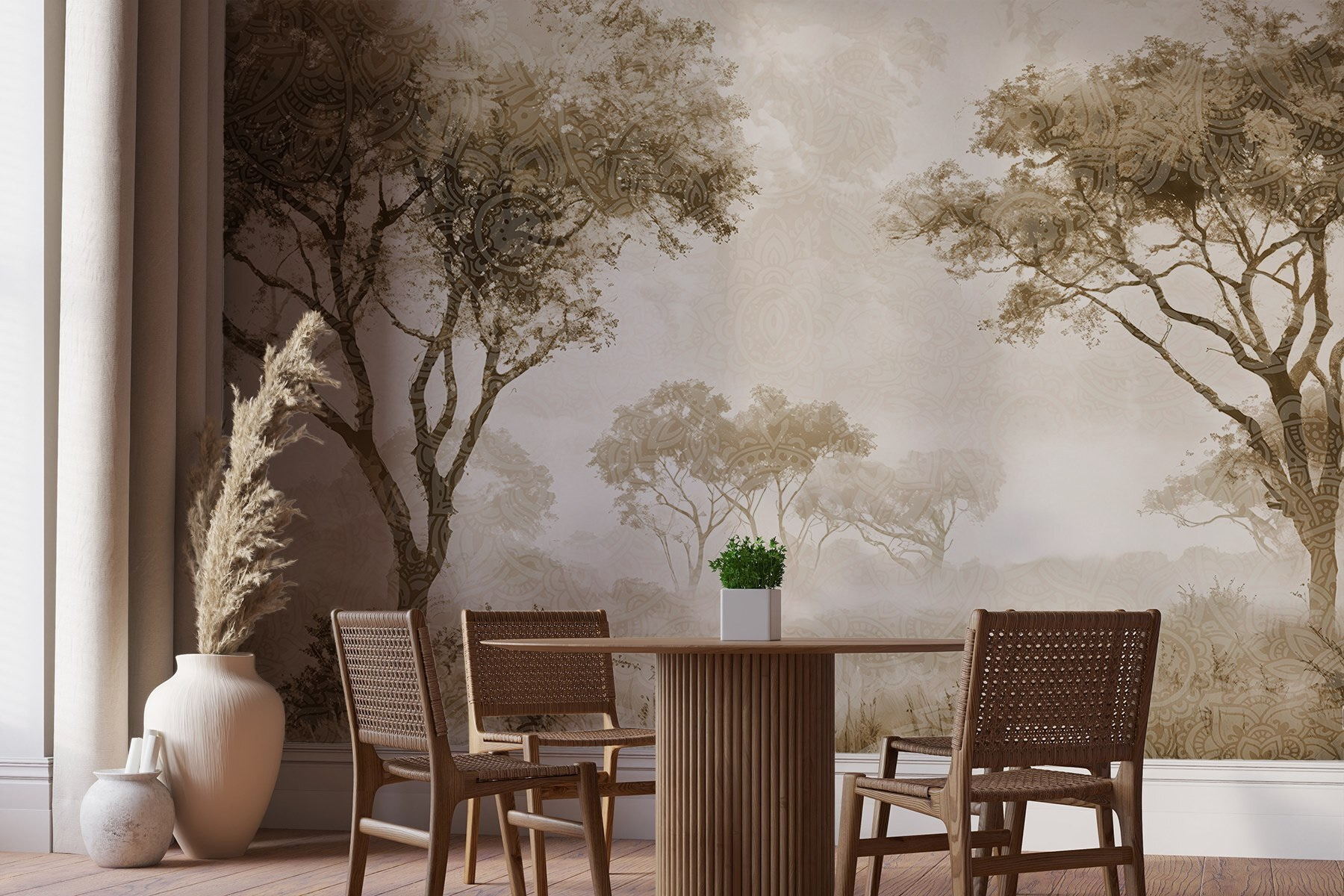 Transformeer je ruimte met de betoverende muurschildering “Groep bomen in een veld”. Het is niet zomaar kunst – het is een rustgevende ontsnapping bij je thuis. Stel je voor dat je wakker wordt in een sereen landschap waar de bomen bijna fluisterverhalen vertellen door de bries. De zachte, aardse tinten creëren een gezellige sfeer, waardoor die luie middagen nog uitnodigender aanvoelen. Stel je voor: een kop koffie in de hand, geen haast, alleen jij en dit rustige tafereel. Perfect voor natuurliefhebbers, het voegt warmte en persoonlijkheid toe aan elke kamer. Ga je gang, laat je muren een beetje magie uitademen!