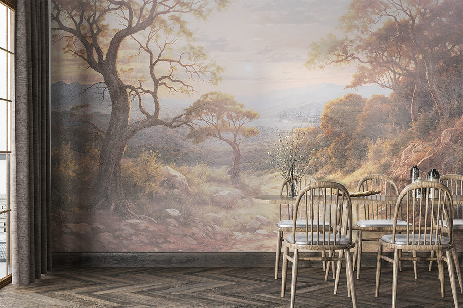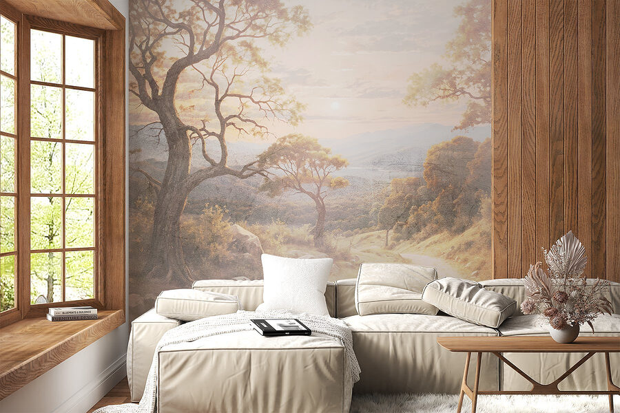 Verander elke kamer in een serene ontsnapping met deze betoverende muurschildering met een kronkelend zandpad geflankeerd door majestueuze bomen en bergen in de verte. Stelt u zich eens voor dat u een rustig toevluchtsoord binnenstapt telkens wanneer u uw ruimte betreedt. De zachte kleuren en zachte texturen trekken je naar binnen, alsof ze je uitnodigen om over dat dromerige pad te wandelen. Perfect voor woonkamers of leeshoekjes, het fluistert kalmte en brengt de schoonheid van de natuur binnen. Denk er maar eens over na: vrienden zouden je kunnen gaan vragen of je naar het platteland bent verhuisd! Verfris je muren en laat de ontspannende vibes stromen; deze muurschildering heeft de magie van de natuur om te delen.