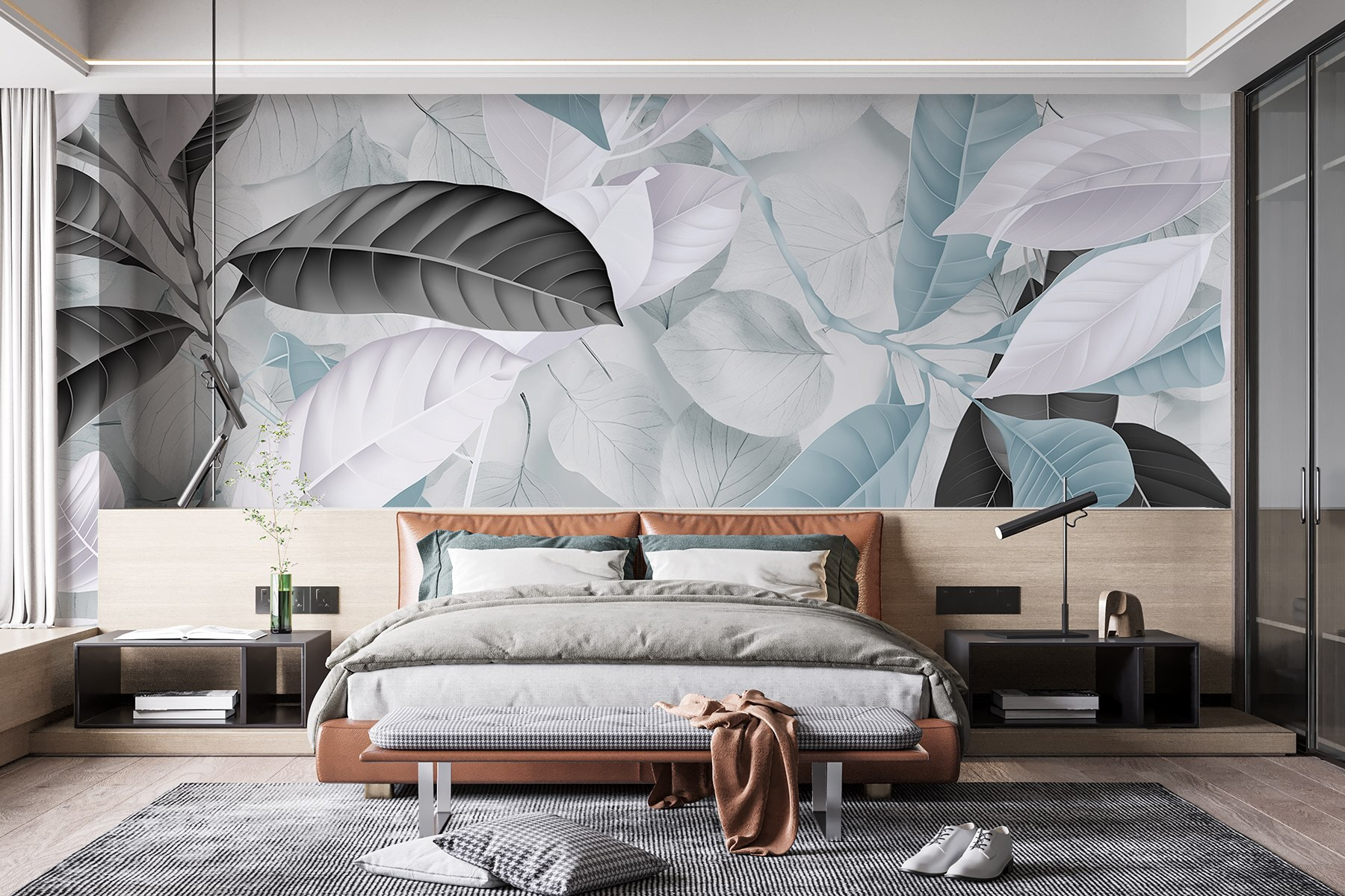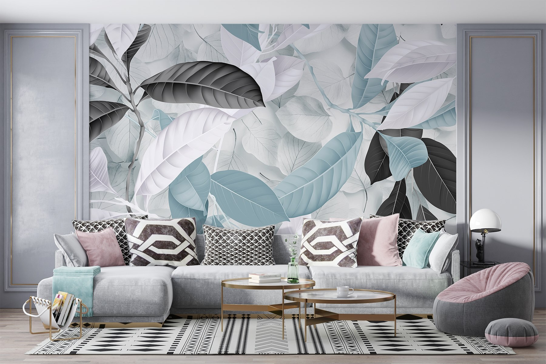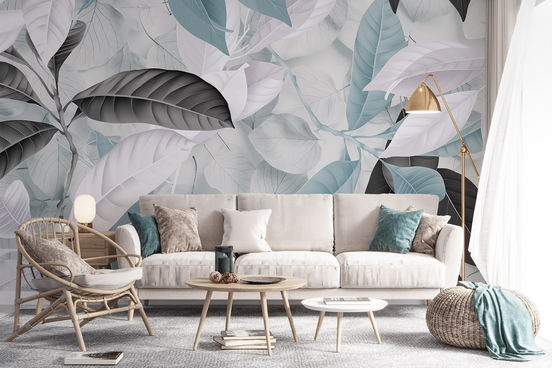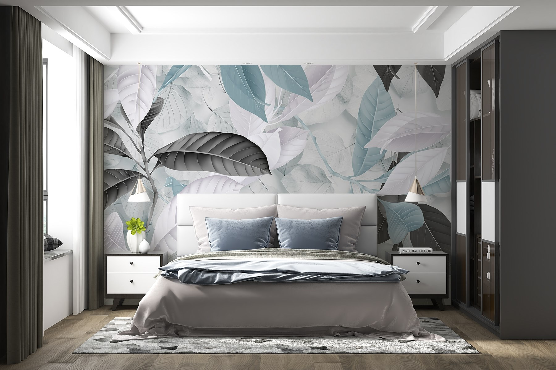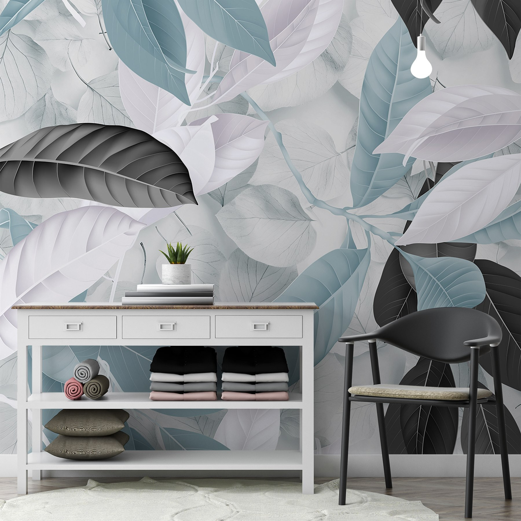 Stel je voor dat je een kamer binnenloopt die aanvoelt als een verfrissende wandeling door een sereen bos. “Soft Hues of Nature’s Beauty” is niet zomaar een muurschildering; het is alsof je het buitenleven binnenhaalt, gelukkig zonder de insecten. Met zijn zachte paletten van blauw, wit en gedempt zwart nodigt dit ontwerp uit tot kalmte en ontspanning. Stel je voor: lekker wegkruipen met een goed boek of een gezellig gesprek met vrienden, omhuld door de natuur. Het is de perfecte achtergrond voor dagdromen, luie middagen of gewoon die ene muur opfleuren die wel wat liefde kan gebruiken. Ga je gang – verander je ruimte in een klein paradijs!