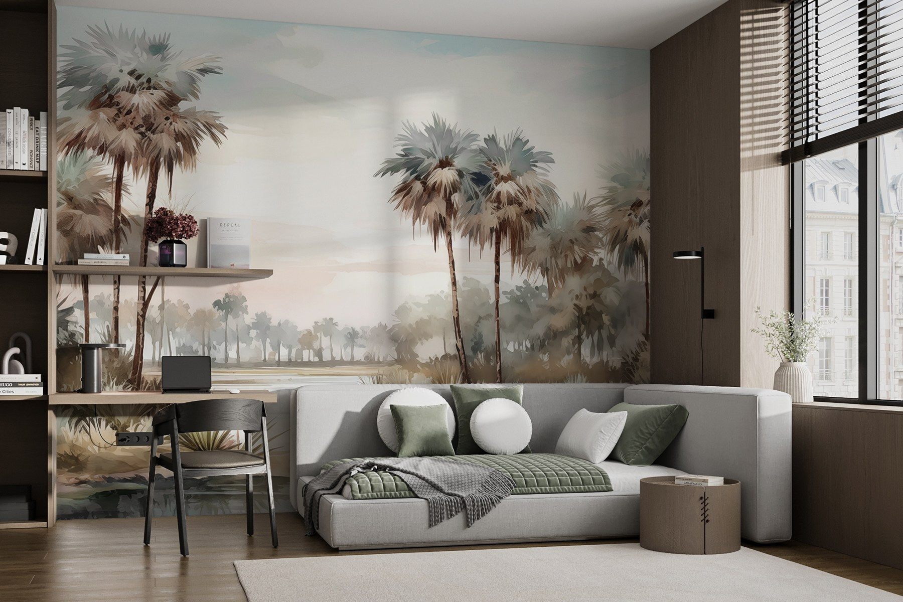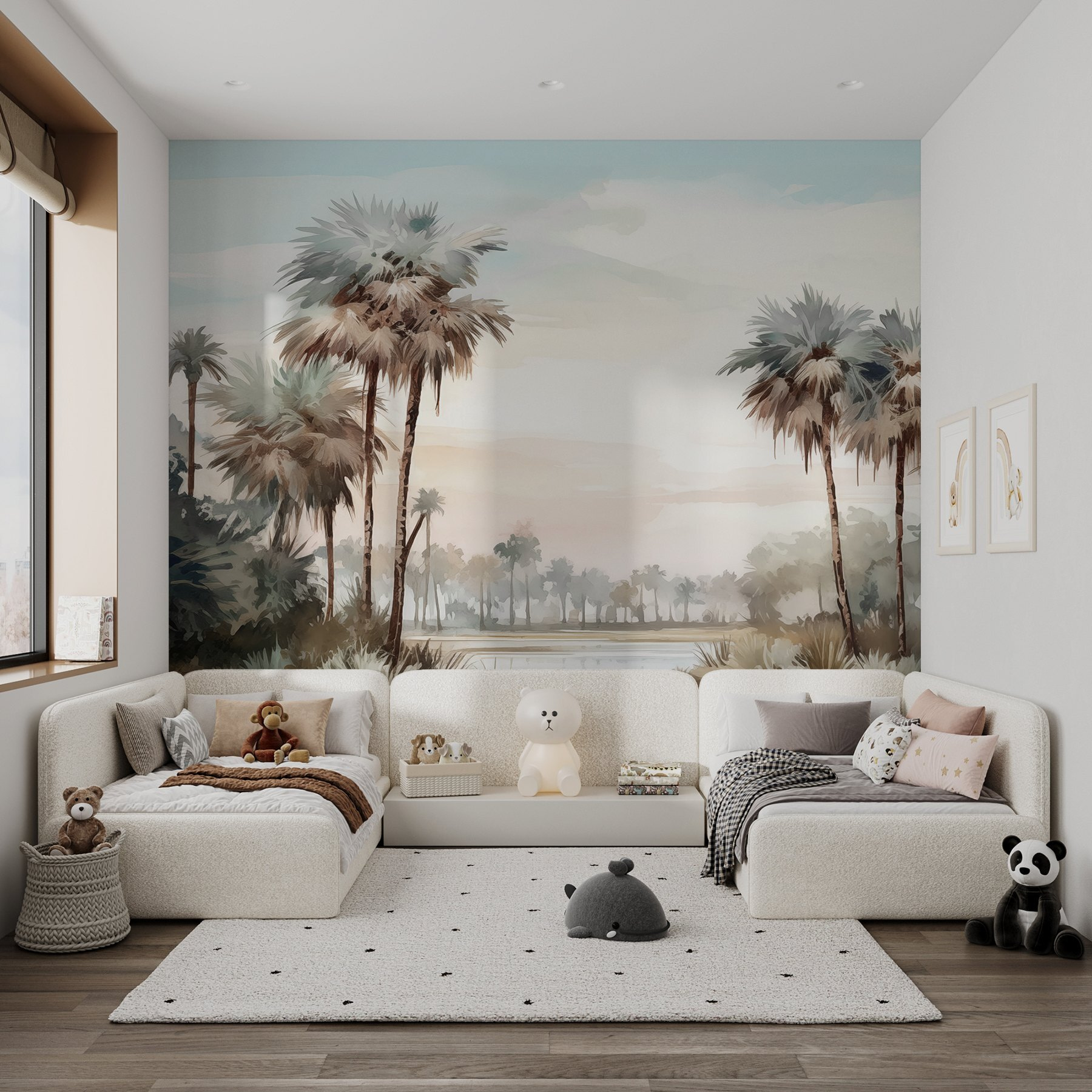 Transformeer je kamer met deze betoverende muurschildering, “Water en palmbomen bij een rivier”. Stel je eens voor dat je een kamer binnenloopt waar weelderige palmbomen zachtjes wuiven boven een serene rivier, waardoor je een stukje paradijs in huis haalt. De zachte kleuren en fijne streken creëren een vredige sfeer – perfect om bij weg te dromen of gewoon een kopje koffie te drinken terwijl je doet alsof je op een strandvakantie bent.