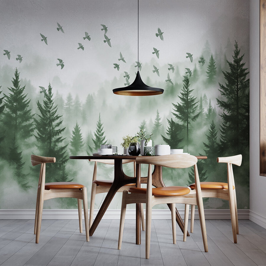 Transformeer elke ruimte met de betoverende muurschildering “Birds Flying Over a Forest”. Stel je voor dat je elke dag wakker wordt in een sereen mistig bos, waar elk detail vrede uitstraalt. Deze sierlijke vogels die erboven zweven geven je muren een vleugje magie en vrijheid. Het is perfect voor gezellige kamers of levendige lounges – overal waar een vleugje charme van de natuur kan gebruiken. Bovendien, wie wil zich niet in een dromerig bos voelen telkens als hij binnenkomt? Deze muurschildering is gemakkelijk aan te brengen en zal je zeker jaloers maken. De subtiele groentinten en rustgevende sfeer van deze muurschildering zullen je de buitenwereld doen vergeten. Ideaal voor dagdromers en natuurliefhebbers!
