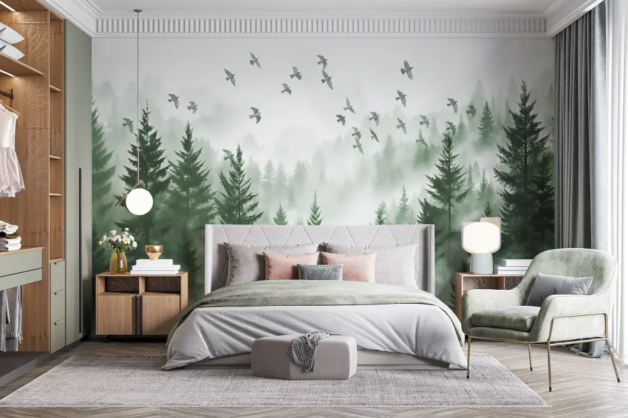 Transformeer elke ruimte met de betoverende muurschildering “Birds Flying Over a Forest”. Stel je voor dat je elke dag wakker wordt in een sereen mistig bos, waar elk detail vrede uitstraalt. Deze sierlijke vogels die erboven zweven geven je muren een vleugje magie en vrijheid. Het is perfect voor gezellige kamers of levendige lounges – overal waar een vleugje charme van de natuur kan gebruiken. Bovendien, wie wil zich niet in een dromerig bos voelen telkens als hij binnenkomt? Deze muurschildering is gemakkelijk aan te brengen en zal je zeker jaloers maken. De subtiele groentinten en rustgevende sfeer van deze muurschildering zullen je de buitenwereld doen vergeten. Ideaal voor dagdromers en natuurliefhebbers!