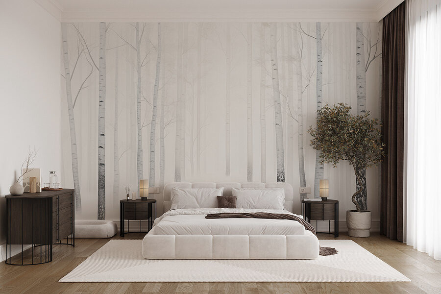 Tover je ruimte om in een sereen winterlandschap met deze muurschildering van een groep bomen in een besneeuwd bos. Stel je voor dat je wakker wordt met een rustgevend tafereel van berkenbomen waarvan de slanke stammen hoog en trots oprijzen tegen een zachte, besneeuwde achtergrond. Het is alsof je een stukje natuur in huis haalt – sneeuwschuiven is niet nodig! Deze muurschildering straalt rust uit en is daarom perfect voor gezellige hoekjes of een serene slaapkamer. Stel je voor dat je je oprolt met een warm drankje, zachte dekens en de zachte stilte van de sneeuw die buiten valt. Een perfecte ontsnapping, gewoon in je eigen huis!