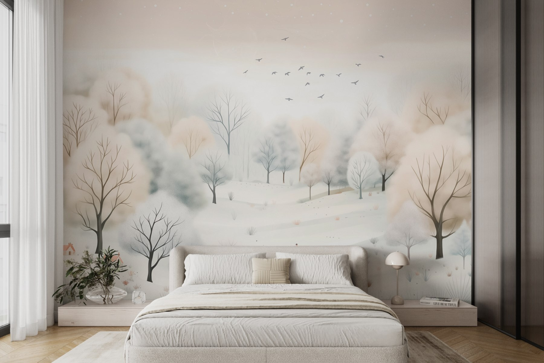 Transform any room into a cozy winter wonderland with this stunning wall mural, “Snowy Landscape with Trees and Birds.” Imagine a soft snowfall, with frosty trees swaying gently as birds glide overhead. It’s like bringing the calm of nature right into your living space—no chilly air, just pure serenity. The neutral tones create a peaceful atmosphere that can brighten up even the gloomiest days. Whether it’s a quiet reading nook or a lively family room, this mural sets the mood. Picture sipping cocoa while wrapped in a warm blanket, gazing at this serene scene—it’s a slice of winter magic, minus the freeze!