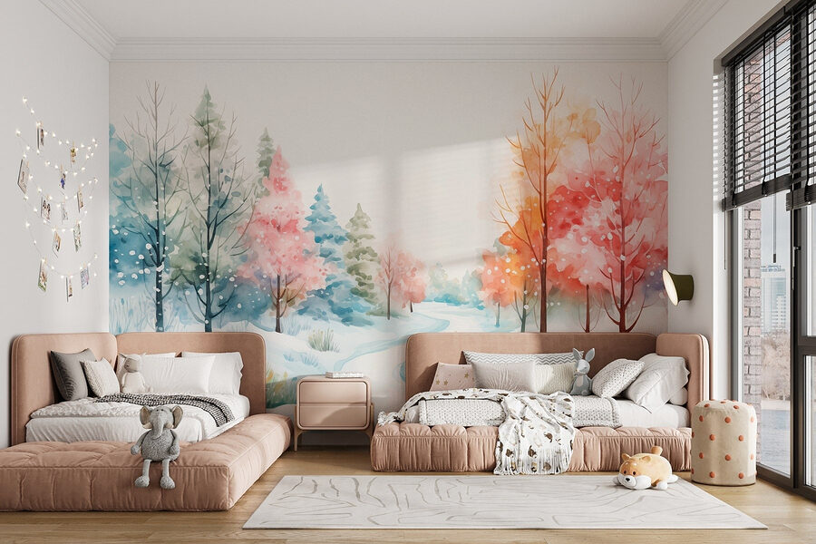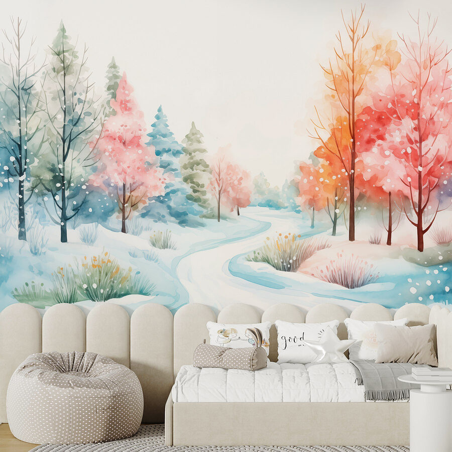 Transformeer elke ruimte met deze dromerige muurschildering met een aquarel van een besneeuwde weg omarmd door bomen. Stel je het zachte knisperen van sneeuw onder je voeten voor en het zachte ruisen van takken die wiegen in de wind. Het brengt een vleugje sereniteit en eigenzinnigheid, perfect om een woonkamer mee op te vrolijken of een studeerkamer mee op te fleuren. De speelse kleurschakeringen van de bomen nodigen zelfs de meest vorstige ochtenden uit tot warmte. Het is alsof je een winterwonderland binnenstapt, zonder de koude tenen en het sneeuwschuiven. Dus waarom zou je je muren niet een verhaal van rust en schoonheid laten vertellen?