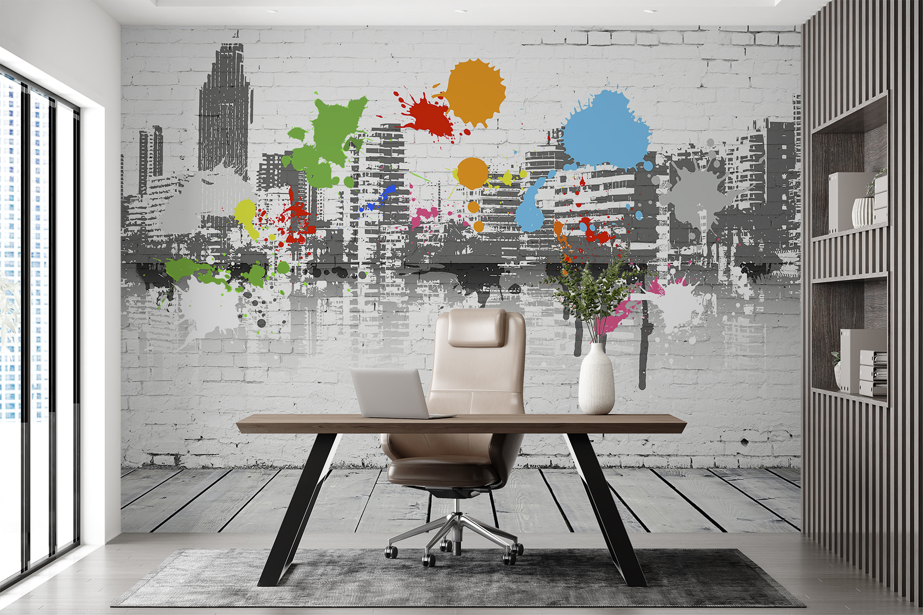 Deze muurschildering is een echte spelbreker voor elke ruimte! Hij heet “Blue Blot on a White Brick Wall”, maar doet veel meer dan alleen een vleugje kleur toevoegen. Stel je voor dat je elke dag wakker wordt met deze heldere, speelse spatten blauw, groen en andere levendige kleuren tegen een koel silhouet van een stadslandschap. Het is alsof je je kamer een uitbarsting van creatieve energie geeft zonder de rommel!