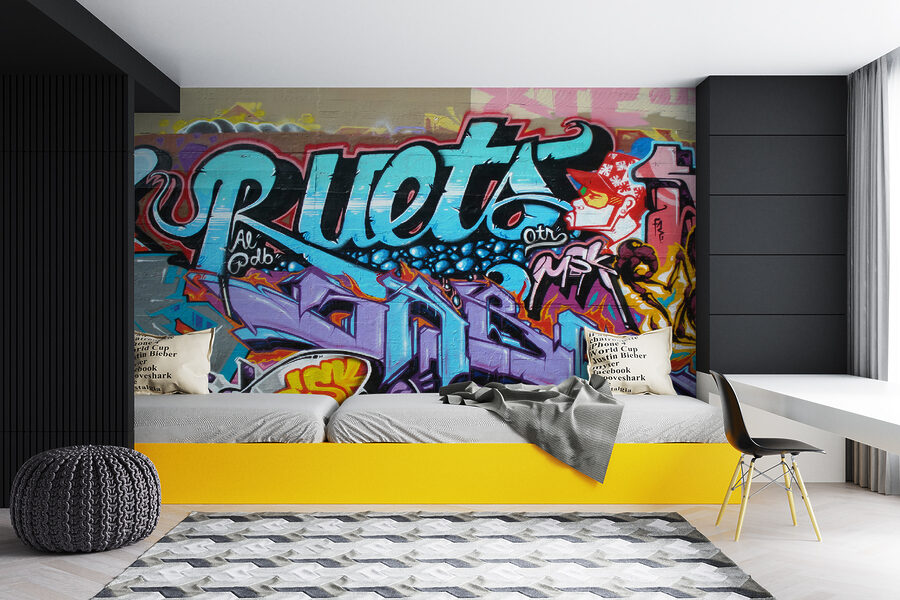Deze muurschildering is perfect voor tieners of jongvolwassenen die een beetje stadsgevoel in hun ruimte willen, en schreeuwt persoonlijkheid uit zonder een woord te zeggen. Het heeft al die levendige kleuren en ingewikkelde ontwerpen die je het gevoel geven dat je door een artistiek zijstraatje in een bruisende stad loopt.