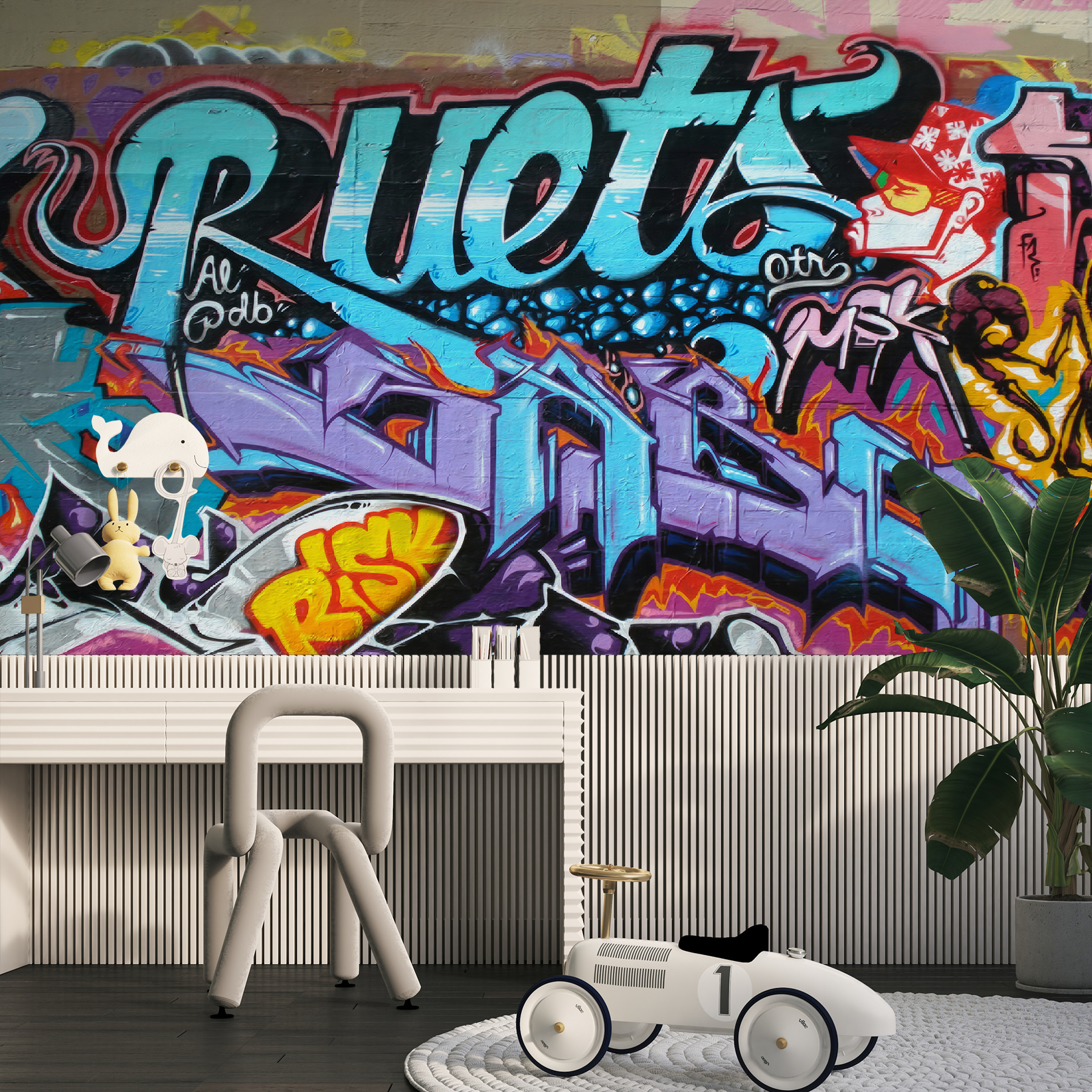 Deze muurschildering is perfect voor tieners of jongvolwassenen die een beetje stadsgevoel in hun ruimte willen, en schreeuwt persoonlijkheid uit zonder een woord te zeggen. Het heeft al die levendige kleuren en ingewikkelde ontwerpen die je het gevoel geven dat je door een artistiek zijstraatje in een bruisende stad loopt.
