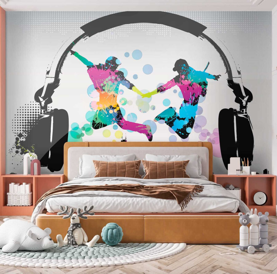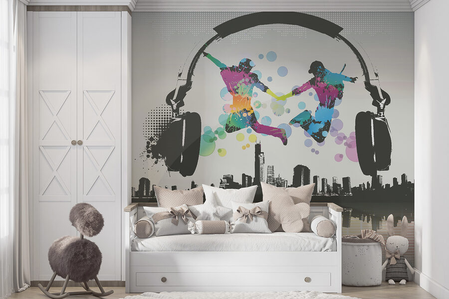 Het ontwerp toont twee figuren die uitbundig springen tegen een achtergrond van een stadslandschap en gigantische koptelefoons – het is alsof ze dansen op hun eigen ritme en iedereen die ze ziet uitnodigen om mee te doen. De gedurfde kleurspatten vallen meteen op en geven je een goed humeur! Bovendien staat het in categorieën als “Designer behang voor aan de muur” en “Populaire muurschilderingen”, dus je weet dat je iets speciaals op het spoor bent.