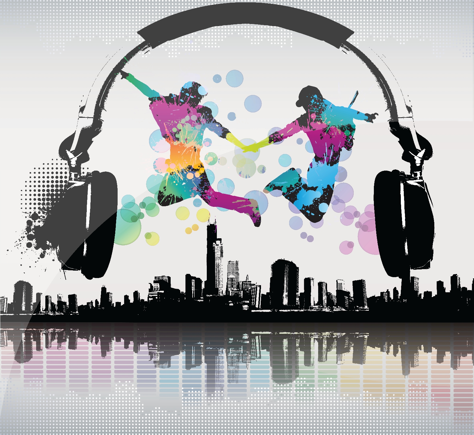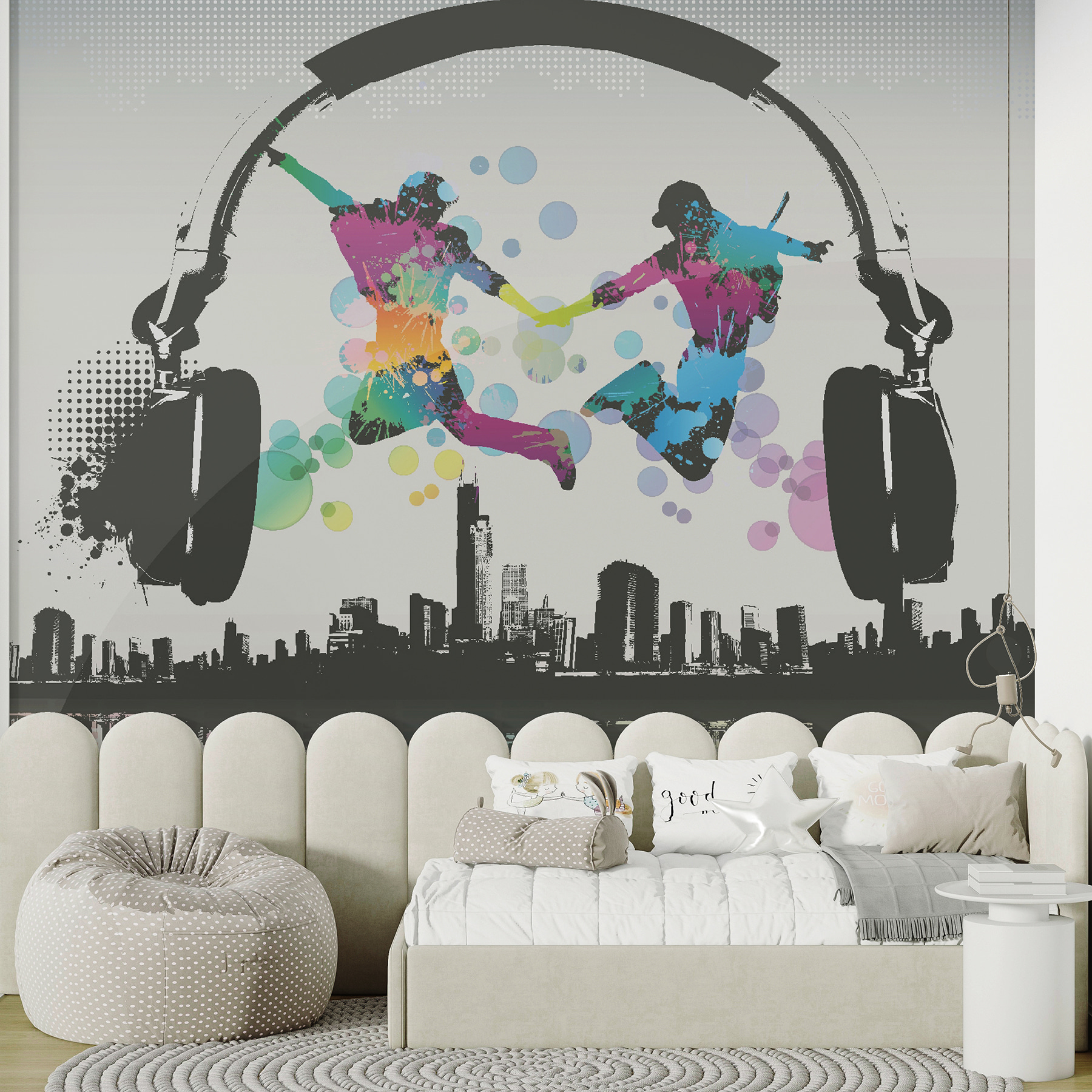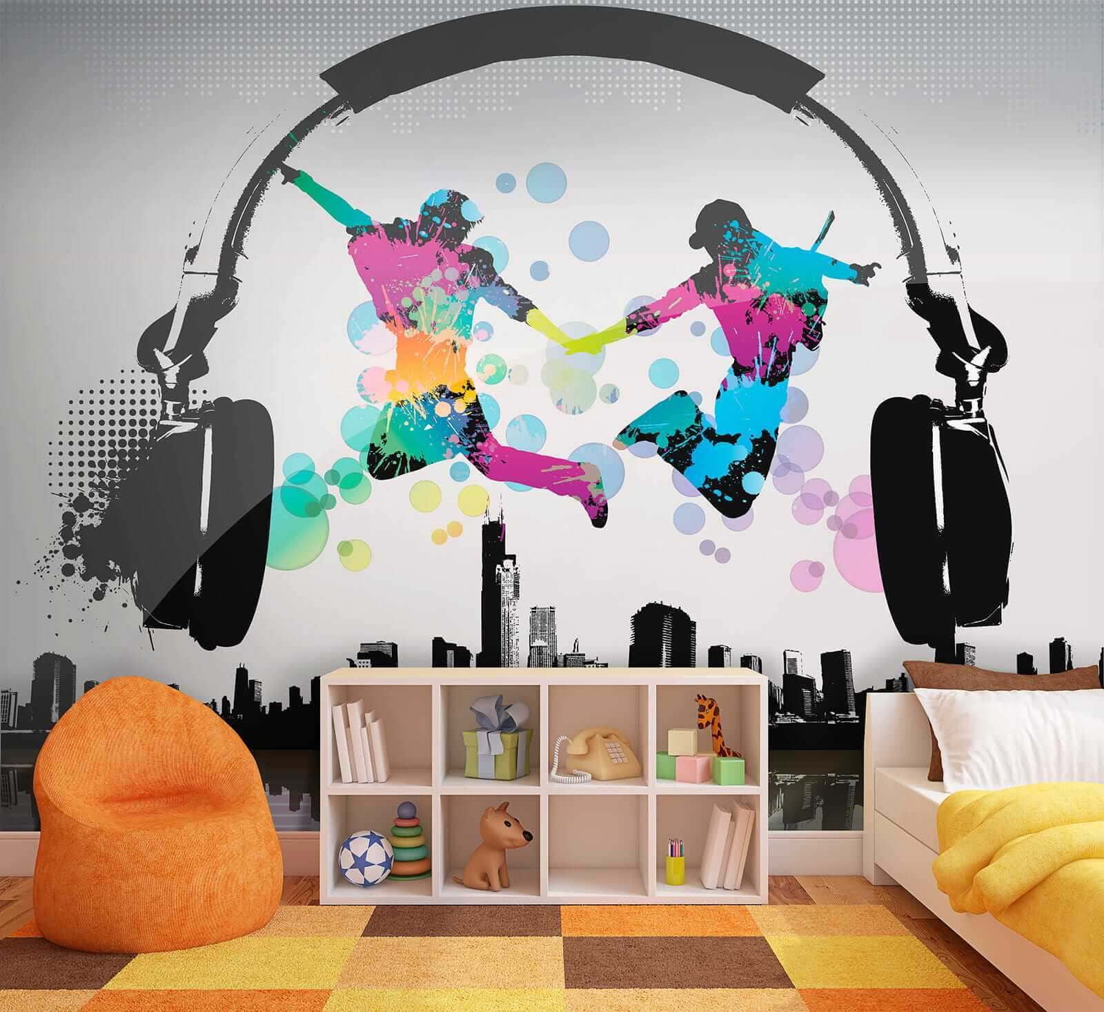 Het ontwerp toont twee figuren die uitbundig springen tegen een achtergrond van een stadslandschap en gigantische koptelefoons – het is alsof ze dansen op hun eigen ritme en iedereen die ze ziet uitnodigen om mee te doen. De gedurfde kleurspatten vallen meteen op en geven je een goed humeur! Bovendien staat het in categorieën als “Designer behang voor aan de muur” en “Populaire muurschilderingen”, dus je weet dat je iets speciaals op het spoor bent.