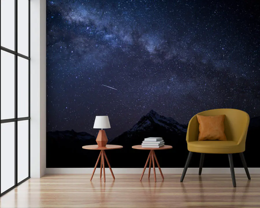 Stel je eens voor dat je een gezellig toevluchtsoord binnenstapt waar grillige bergen en sterren elkaar ontmoeten – ja, dat is de magie van deze muurschildering! Het verandert je muur in een adembenemend nachtlandschap en nodigt de rust van de bergen uit om je kamer binnen te komen. Stel je een knusse leunstoel voor, misschien een warm drankje in de hand, terwijl je ogen afdwalen naar de toppen die geheimen van het universum lijken te fluisteren. Het is net alsof je je eigen kleine ontsnapping hebt, perfect om te dagdromen of om laat op de avond een praatje te maken. En wie wil er nu geen indruk maken op gasten met een uitzicht dat zegt: “Hé, ik zit diep in de bergen, in ieder geval qua inrichting!”. Het draait allemaal om het creëren van die chille sfeer. Perfect voor elke hoek – slaapkamers, woonkamers of zelfs een creatieve werkruimte.