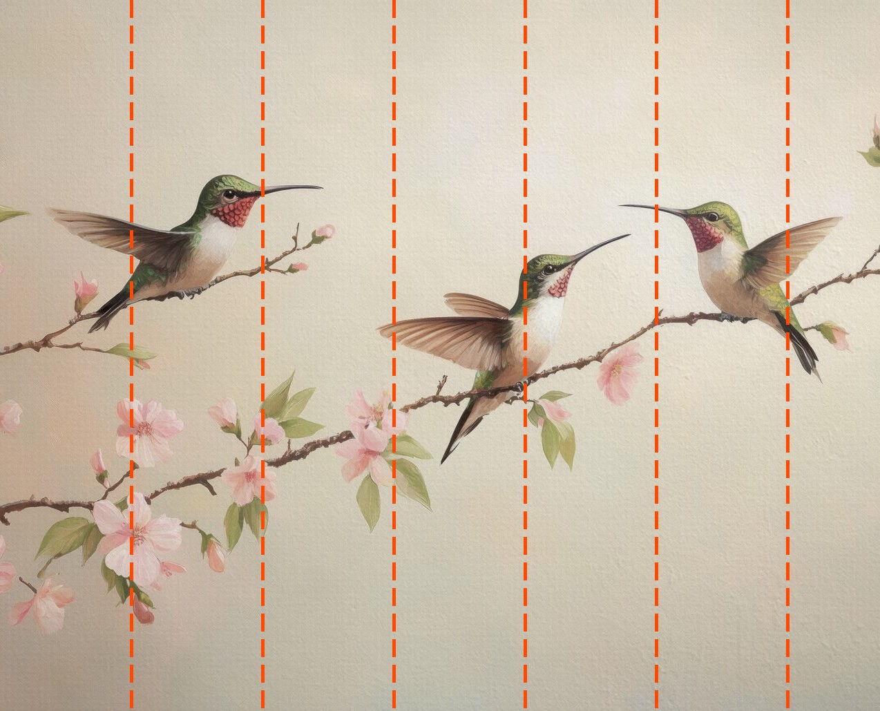 Fotobehang Schilderij van kolibries op een tak met bloemen