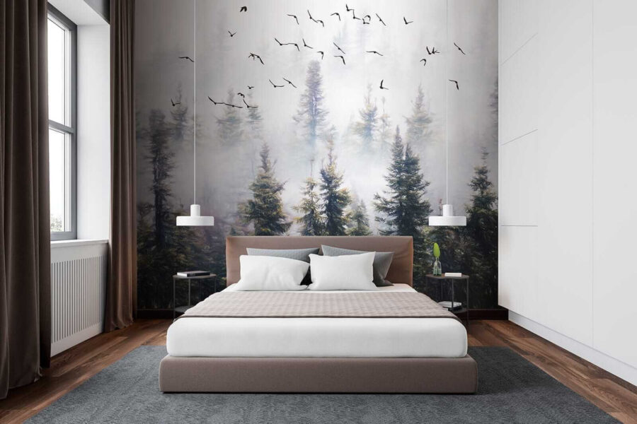 Transformeer je ruimte met deze prachtige muurschildering van vogels die gracieus door een mistige lucht zweven. Het is alsof je een stukje natuur in huis haalt, waar elke blik als een frisse wind aanvoelt. Stel je voor dat je ‘s ochtends aan je koffie nipt terwijl je naar het serene tafereel staart – een instant sfeerbooster. De zachte kleuren passen perfect bij elk interieur, waardoor het super veelzijdig is. Perfect voor een gezellige woonkamer of om een rustige sfeer toe te voegen aan een slaapkamer. Het is meer dan gewoon behang; het is een uitnodiging om te dagdromen. Laat de vogels je opvrolijken en breng wat natuurmagie mee naar huis.