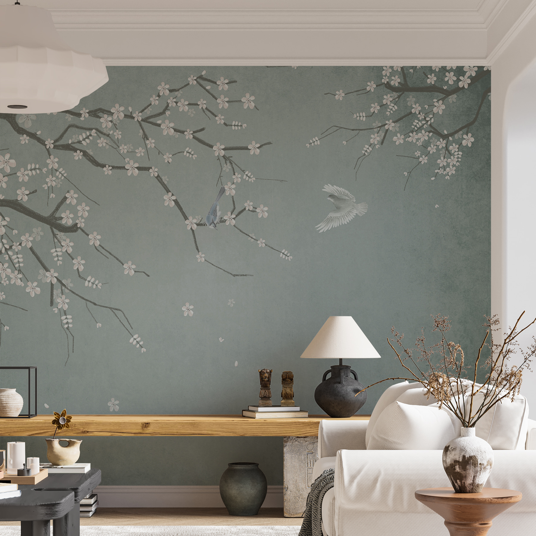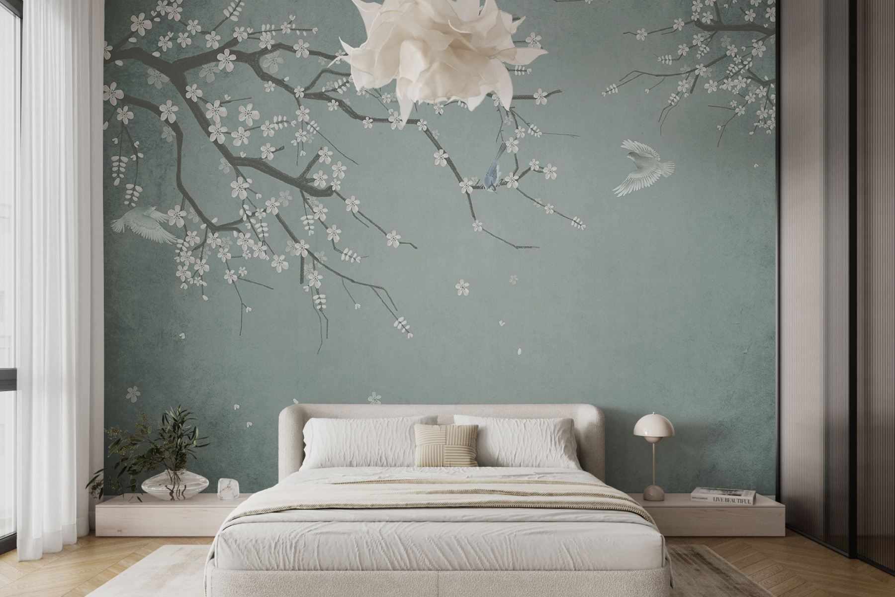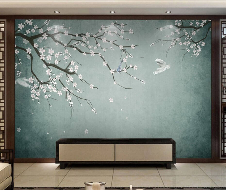Stel je voor dat je een kamer binnenstapt waar rust en kunst elkaar ontmoeten – “Birds and Blossoms in Serene Harmony” doet precies dat! Stel je voor: tere kersenbloesems en vogels die zich mengen op je muur en een stukje paradijs creëren. Het is alsof je het zachte gefluister van de lente naar binnen haalt.