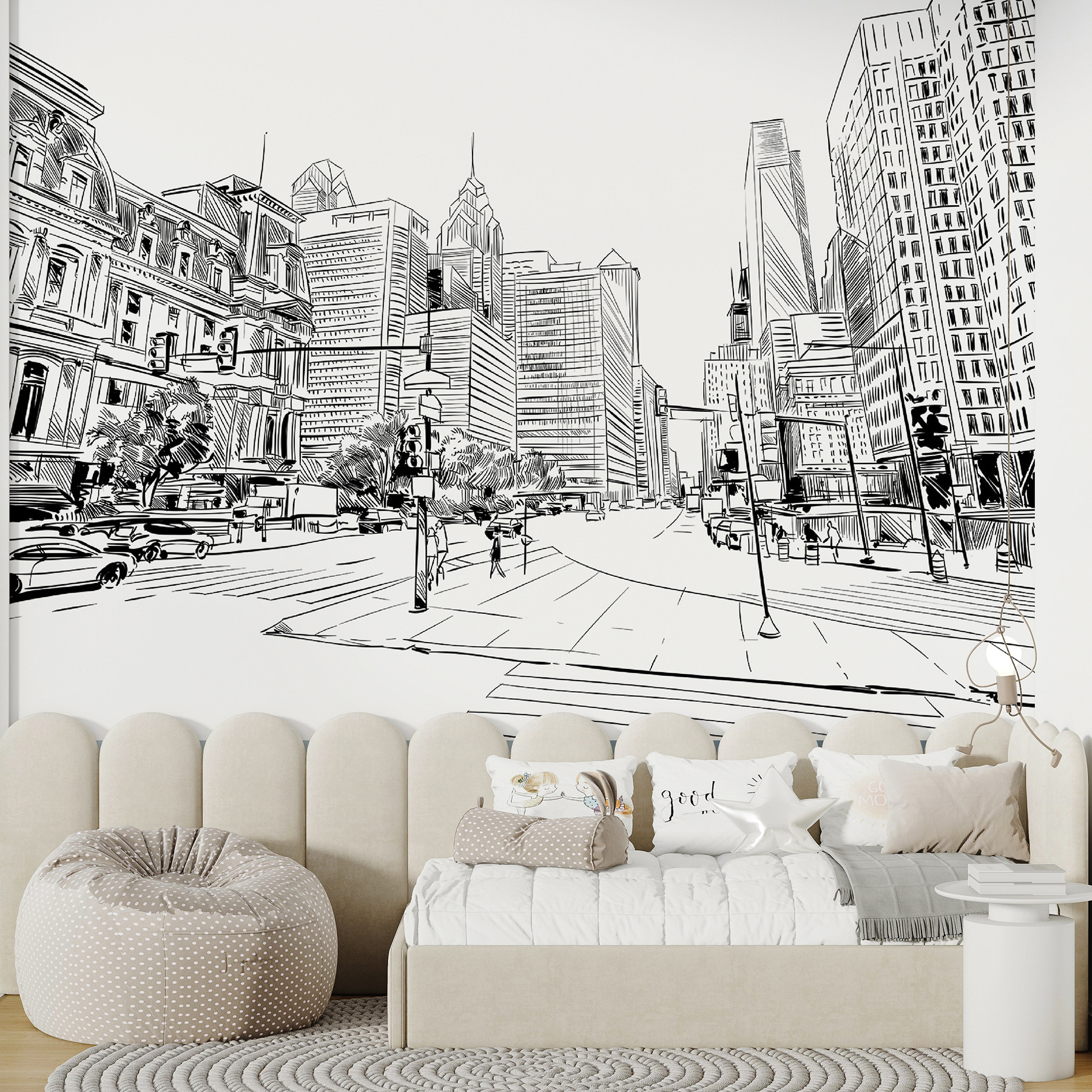 Hallo daar! Bekijk deze coole muurschildering – het is een zwart-wit schets van een stadslandschap dat rechtstreeks uit een stripboek lijkt te komen. Kun je je voorstellen dat je zo wakker wordt? Het is alsof je een bruisende stad in je woonkamer hebt, zonder het lawaai en de drukte. Perfect om wat urban chic aan je kamer toe te voegen, toch?